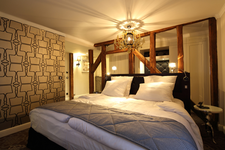 Das Designkonzept eines modernen Grandhotels mit barocken Highlights findet sich individuell interpretiert, auch in den drei Zimmertypen – Classique-Suiten, Château-Suiten und Young Spirit-Suiten, wieder. Das Design der Classique-Suiten erinnert mit Formen, Farben und Mustern am stärksten an ein herrschaftliches Grandhotel: Beige bis hellbraune Farbnuancen in Textilien, Tapeten und Möblierung verschmelzen mit edlem Gold und Chrom der modernen Leuchten und Accessoires, während klassisches Schwarzweiß auf einem Polsterstoff im Hahnentrittmuster Akzente setzt. Auch die Texturen der Oberflächen spielen mit den Gegensätzen: Es mixt sich zum Beispiel gekonnt Glänzendes mit Fellartigem oder Raues mit Glattem, um die Sinne des Gastes dezent zu inspirieren. Eingerahmt werden die Suiten von einer dezenten, leicht glänzenden, beigefarbenen Tapete mit moderner Tischleuchtensilhouette und einem braunem Teppichboden mit opulentem barockem Muster in Hellgrau. Zweigeschossig, im dritten und vierten Obergeschoss, befinden sich die Duplex-Suiten, die dem Design nach zu den Classique-Suiten zählen. Besonderen Charme verleihen ihnen die alten Balken, Nischen, Decken und Dreiecksfenster des Haupthauses, die mit viel Fingerspitzengefühl in das neue Design eingebunden wurden.