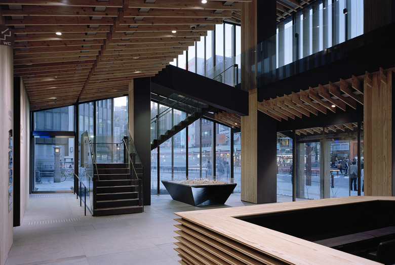 In the corner premise of just 326㎡ across Kaminari-mon Gate, the building was required to accommodate plural programs such as tourist information center, conference room, multi-purpose hall and an exhibition space. The center extends Asakusa’s lively neighborhood vertically and piles up roofs that wrap different activities underneath, creating a “new section” which had not existed in conventional layered architecture. Equipments are stored in the diagonally shaped spaces born between the roof and the floor, and by this treatment we could secure large air volume despite its just average height for high-and medium-rise buildings. Furthermore, the roofs not only divide the structure into 8 one-storied houses but also determine the role of each floor. First and second floor has an atrium and in-door stairs, creating a sequence from which you can feel the slope of the two roofs. On 6th floor, taking advantage of the slanted roof, we were able to set up a terraced floor with which the entire room can function as a theater. As angles of the roofs inclined toward Kaminari-mon and the heights from the ground vary from floor to floor, each floor relates differently to the outside, giving a unique character to each space.
