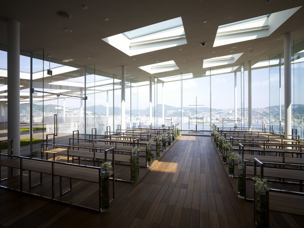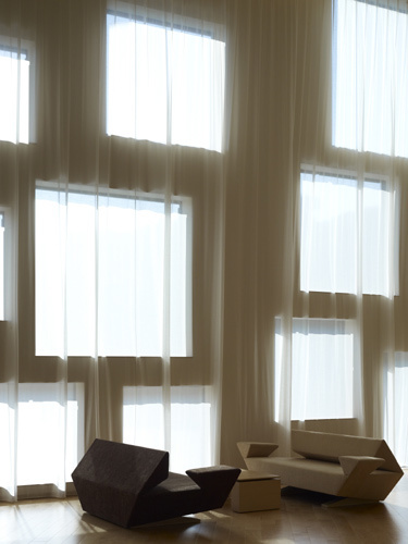 In the main hall (the largest space), two of the walls are inflected at the top so that they transform into the roof. The area under the roof is resolved as a void filled with thin pillars and small glass boxes, rather than as a solid. Its ‘roof-ness’ is therefore emphasized, as is the dual role of the box/roof.