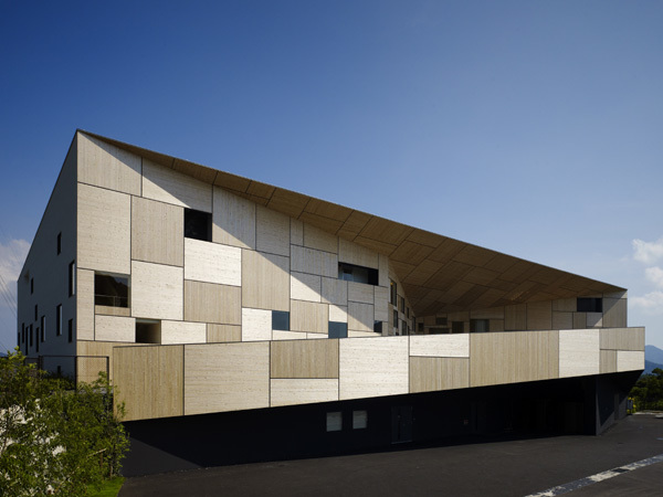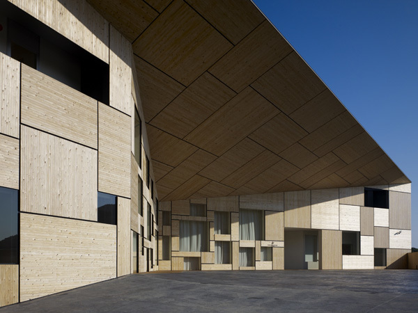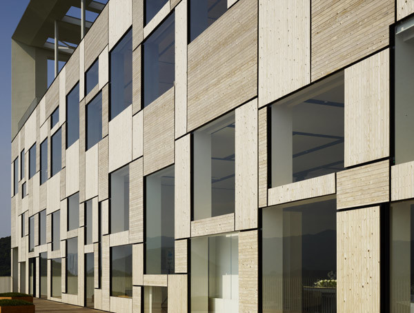 As for the ‘made of wood’ aspect, we did not interpret that to simply mean using lots of wood for the exterior and interior of the building. Because trees are naturally much smaller than these large buildings, a huge gap in scale exists between the two forms, making it difficult to achieve the idea of ‘made of wood.’ To solve the problem we created wooden panels sized midway between a tree and the volume of the building. This worked well to create a sense that the buildings are ‘made of’ wood.