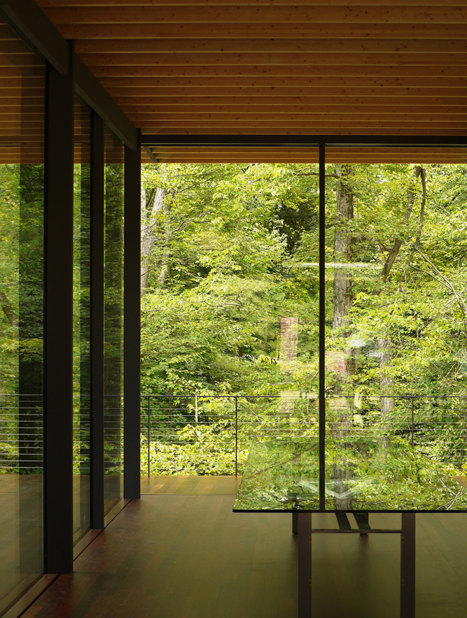 The existing building was a symmetric glass box of Palladian villa architecture, standing solitarily in a forest. We built a new house to make this glass box orthogonal and formed an L-shaped terrain, as an attempt to create a kind of “intimacy” in the forest. Philip Johnson’s house stands alone, so we proposed the L-shaped plan in which the new building hitched on the old one, in order to present a new relation between the nature and the architecture. L-shaped plan is considered the prototype of the staggering layout in traditional Japanese architecture, which allows two axes to cross, frame varied spaces, create a sense of floating in the corners, and allow one to change consciousness by turning.