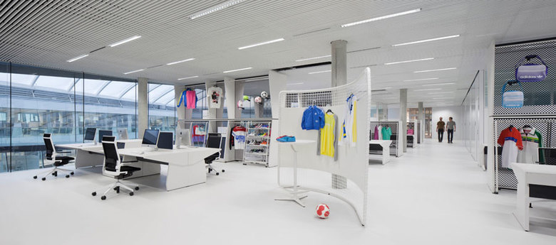 Kinzo entwickelt für adidas ein Raum- und Möbelprogramm, das höchste funktionale Ansprüche mit der spektakulären laces-Architektur von kadawittfeld vereint. Das Möbeldesign greift die kommunikative Architektursprache auf und vervollständigt den Bürokomplex zu einem beeindruckenden Erlebnis mit der ästhetischen Qualität und Kontinuität eines Filmsets – als sei die Möblierung Teil der Architektur oder die Architektur Teil der Möblierung. Das Sortiment aus knapp 50 Teilen ermöglicht zahlreiche Raum-Funktions-Varianten. Und am Ende garantieren umweltschonend pulverbeschichtete Oberflächen eine innovative Wertigkeit, die das Design zusätzlich veredeln.