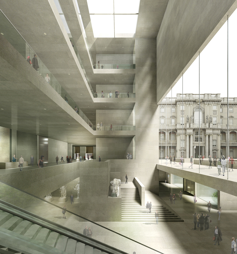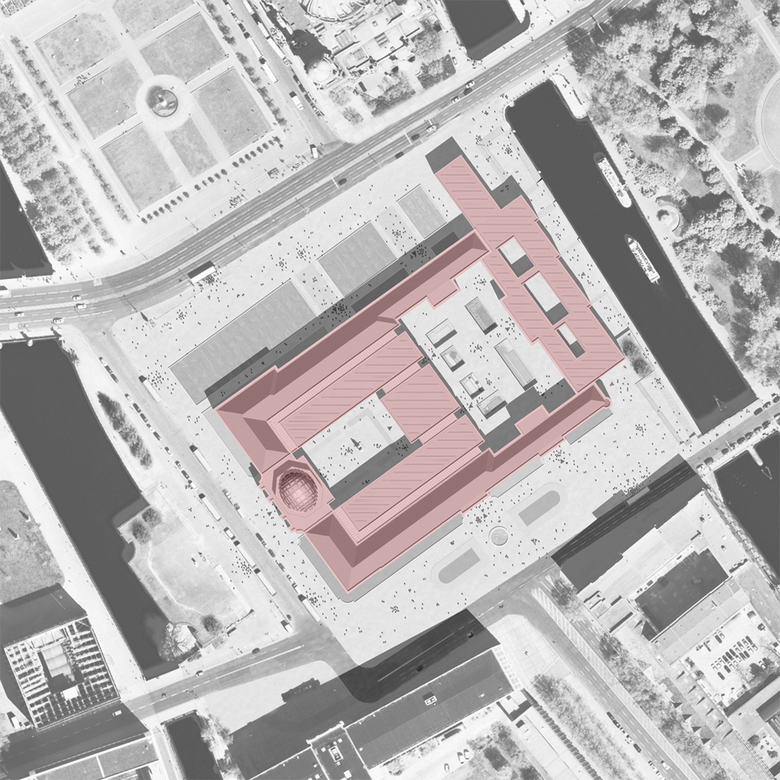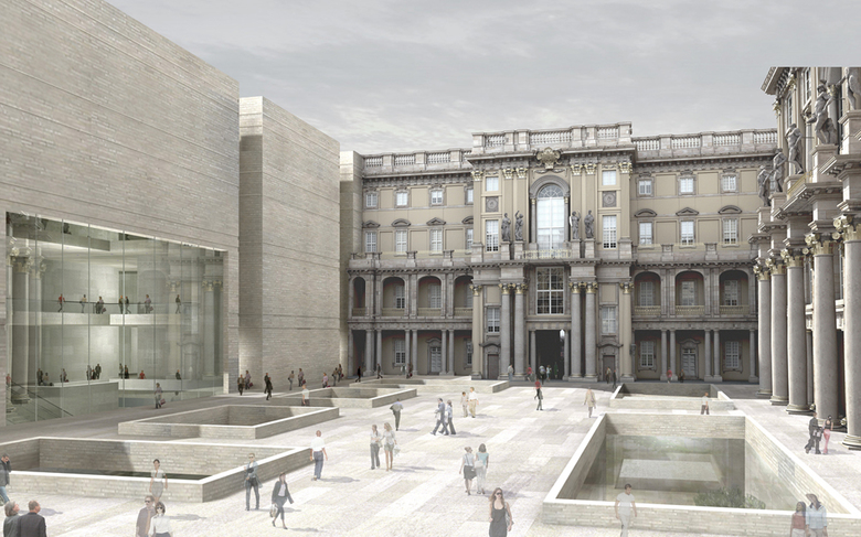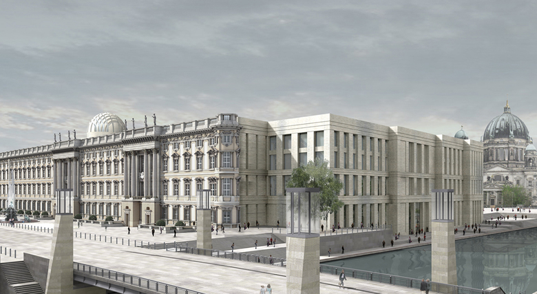 Die Leitidee für den Entwurf ist auf den Begriffen Geist des Ortes und Entdeckungslust aufgebaut. Folgende Prämissen wurden herausgearbeitet: die Weiterentwicklung auf Grundlage der ehemaligen Strukturen, also Geschosshöhe und Kubatur; die klare Trennung zwischen historisch rekonstruierten und neuen Bauteilen und die Fuge zwischen der Kubatur des ehemaligen Eosanderhofes und dem eingestellten Volumen des Museums. Im Einzelnen bedeutet dies: die Komplettierung der historischen Figur des Schlüterhofs mit der neuen Fassade des Mittelflügels, dem Eingangsbauwerk für das Humboldt-Forum. Der Ostflügel oder auch Apothekerflügel erhält eine zur Spree hin gestaffelte Fassade, eine Entwicklung aus der Überlagerung der historischen Gliederung des Baukörpers und der schräg zum Gebäude verlaufenden Uferkante. In den Eosanderhof werden mit einer Fuge von vier Metern Breite zwei neue Museumsflügel eingestellt. An dieser Stelle findet die stärkste Setzung gegenüber der historischen Raumfigur statt. Die Fuge zwischen der historischen Raumgrenze des Eosanderhofes und den neuen Ausstellungskuben dient der Belichtung und Orientierung im Haus. Unter der Kuppel wird die Galerie der Weltkunst präsentiert. Aus dem Rundgang der Ausstellung im 3. OG tritt der Besucher in den beeindruckenden 35 m hohen Kuppelraum, von der er den Blick über die Dächer der Stadt schleifen lassen kann.