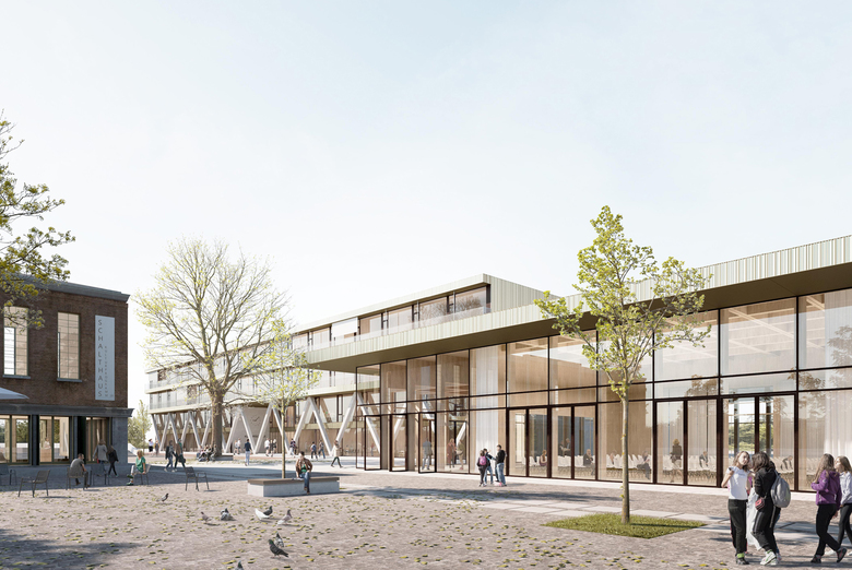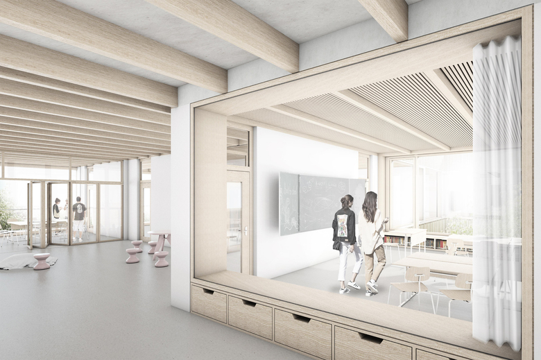 Der Entwurf sieht eine Schule mit vielfältigen räumlichen Verbindungen, Sichtbeziehungen und differenzierten Raumstrukturen vor. Aula und Schulhaus sind räumlich und funktional miteinander verbunden, rechtwinklig dazu angeordnete befindet sich die abgesetzte Turnhalle. Das Foyer bindet vom Platz zur Südterrasse durch und verbindet den Bastionsplatz mit der Aula, der Mensa, dem Lernhaus und der Terrasse. Durch den zurückgesetzten Eingang gelangt man in die zweigeschossige Halle aus der alle Nutzungsbereiche angebunden werden. Die vier Treppenräume liegen immer an den Lichthöfen – die der Verbesserung des Mikroklimas, der Belichtung und der schallgeschützten Belüftung der Nutzungen dienen – die äußeren Höfe wirken dabei wie Wintergärten. Ergänzend zu den schulischen Nutzungen wird ein Repair Café angeboten, in dem die Jugendlichen in ihrer Freizeit Fahrräder, Mofas und andere technische Gegenstände reparieren und zugleich ihre Freizeit wie in einem Jugendtreff verbringen können. Die Schule schafft den Rahmen für einen ganzheitlichen Lernansatz über den eigentlichen Unterricht hinaus mit Angeboten zur Tages- und Freizeitgestaltung. Kulturelles und ästhetisches Lernen wird durch eine identitätsstiftende Architektur gefördert, indem das Schulhaus den ressourcenschonenden Umgang mit Baustoffen zeigt und dabei eine nachhaltige Materialästhetik vermittelt.