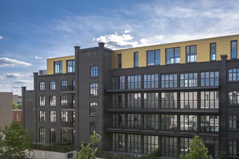 Im südlichen Gebäudeteil befinden sich 18 moderne Wohnungen mit variierenden Wohnflächen von 50 bis 150 m². Großformatige Fenster, gusseiserne Stützen und stützenfreie Stahlbetonträger kennzeichnen die Wohnräume und bewahren den industriellen Charme der alten Fabrik. Die Stützen aus Gusseisen wurden aus brandschutztechnischen Gründen aufwändig aufgearbeitet. Eingestellte Boxen bilden losgelöst davon die Infrastruktur mit Bad, Küche, Gäste-WC und Schrankelement. So entstanden in Zusammenhang mit den großen Fenstern großzügige Loftwohnungen mit fließen-den Räumen. Durch die Ost-West Ausrichtung gibt es zudem viel Licht. Eine Etage wurde auf das Dach gesetzt, sodass weitere Wohnfläche generiert wurde, ohne die denkmalgeschützte Struktur zu verändern. Gemeinsam mit den umliegenden Wohnungsbauten, die in den vergangenen Jahren auf dem Areal geschaffen wurden, entstand ein begrünter Innenhof.
