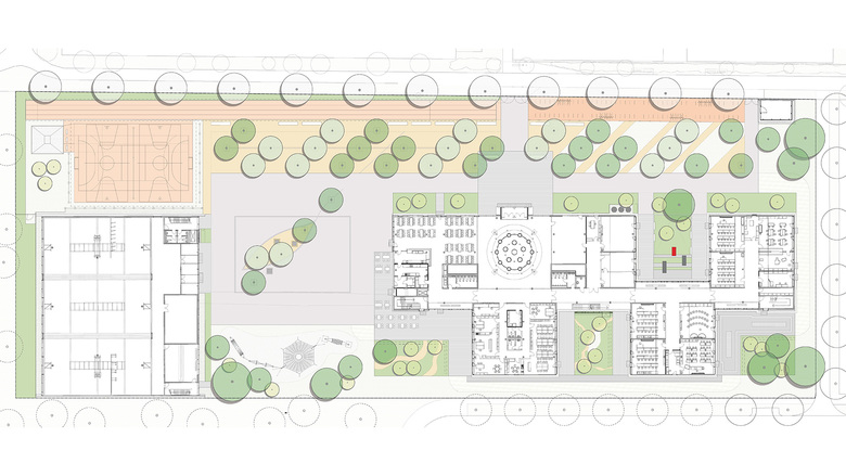 Neubau einer 5-zügigen Grundschule, 2-zügigen Mittelschule mit Ganztagesangebot und einer 3-fach Sporthalle. In den beiden Obergeschossen sind 33 Regelklassen mit Gruppenräumen untergebracht. Im 2. OG befinden sich zusätzlich zu den Regelklassen die Lehrküche, Förderzimmer und Gruppenräume für die Sozialarbeit. Die Grundidee des Entwurfs basiert auf einer differenzierten Baukörperausbildung und der inhaltlichen Idee von 5 thematisierten Einzelhäusern, die an einer Erschließungsspange versetzt aufgefädelt sind. Diese können flexibel für neue pädagogische Ansätze genutzt werden. Der übergeordnete Gedanke wird geprägt durch die Identifikation der Schüler mit „ihrem Haus“. Auf einem rechteckigen Grundstück liegt der Pausenhof eingebettet zwischen Schule und Sporthalle. Entlang der Nordgrenze, worüber der Zugang auf das Grundstück erfolgt, sind sowohl Fahrradabstellplätze und Gerätehaus als auch die Sportanlagen mit Tartanbahn und Allwetterplatz angeordnet. Über einen Vorplatz wird die Schule über eine zentrale Halle, die von einer weitgespannten Schalenkonstruktion überspannt wird, erschlossen. Von hier aus werden alle Sondernutzungen wie Aula, Mensa, Lehrerzimmer, Ganztagesbereich und Fachklassen im EG erreicht. Die Aula als Versammlungsstätte kann durch mobile Trennwände mit der Mensa und dem Ganztagesbereich erweitert werden. Zwischen den Häusern entstehen im EG Höfe, die als Themenhöfe landschaftsarchitektonisch individuell gestaltet und von den Fachklassen für den Unterricht unter freiem Himmel genutzt werden können. Eine Erschließungsmagistrale mit hohen Aufenthaltsqualitäten und individuellen Lern- und Aufenthaltsbereichen verbindet die einzelnen Häuser. Diese bieten durch ihre Struktur einen hohen Identifikationsgrad und wirken durch klare, übersichtliche Raumgestaltung als „stiller Erzieher“ mit. Im Hinblick auf zukünftige, neue Lernkonzepte ist die Raumgestaltung so angelegt, dass auch moderne, neue Lehrraumstrukturen innerhalb eines Bausteins realisiert werden können. So entsteht eine möglichst hohe Flexibilität in der räumlichen Nutzung.