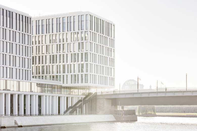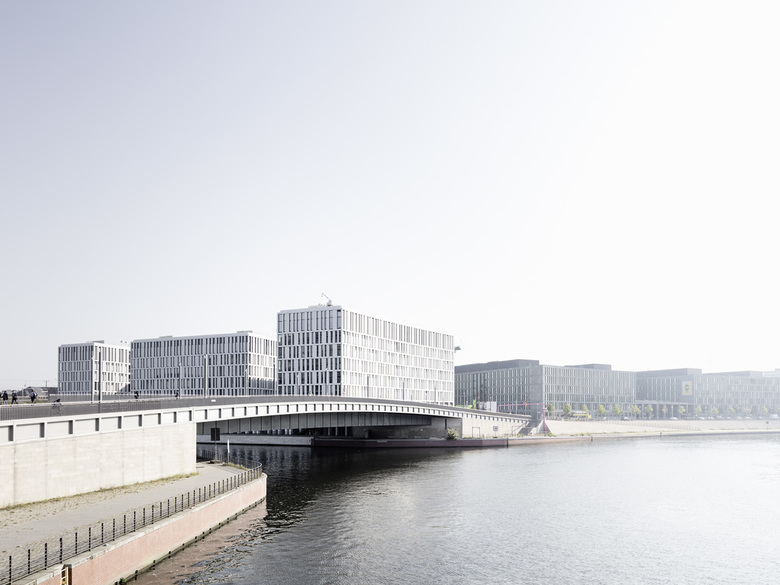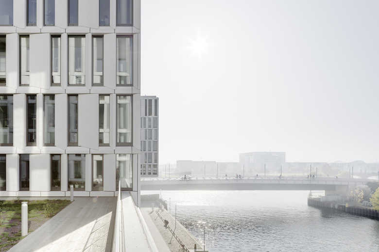 Der sieben- bzw. achtgeschossige Neubau am Humboldthafen bildet analog zur vorgesehenen Blockrandbebauung klare Raumkanten. Durch die mäanderförmige Baukörperfigur werden in den Obergeschossen mit Büronutzung die Höfe nach außen hin geöffnet. Alle Mieteinheiten des Bürogebäudes haben dadurch einen Ausblick zum Humboldthafen und zur Spree. Entlang der Uferpromenade am Humboldthafen sind Arkaden und öffentliche Nutzungen wie Cafés und Restaurants vorgesehen.