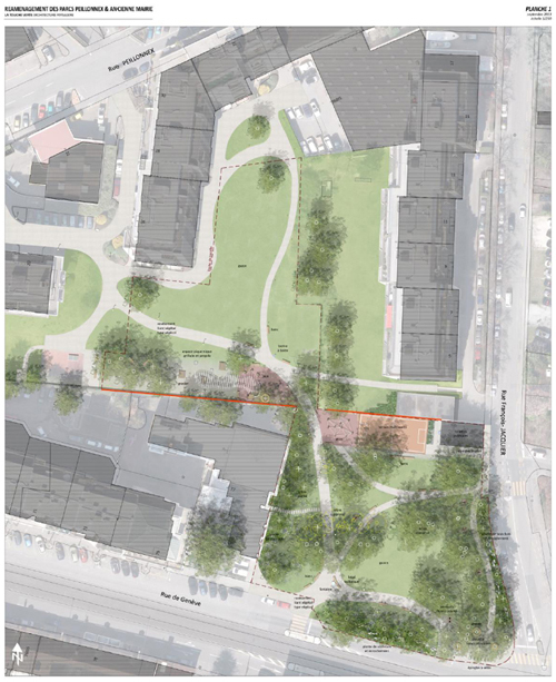 Réaménagement des parcs Peillonnex et de l'Ancienne Mairie avec comme charnière la restauration du mur historique sur lequel s'appuie la zone de loisir (terrain multisports, jeux, pique-nique, ...).