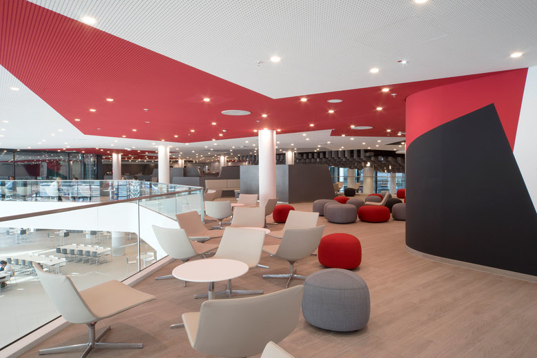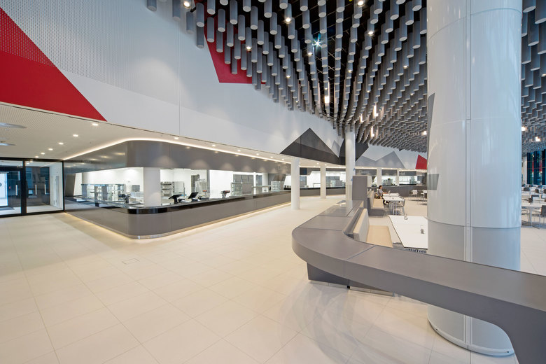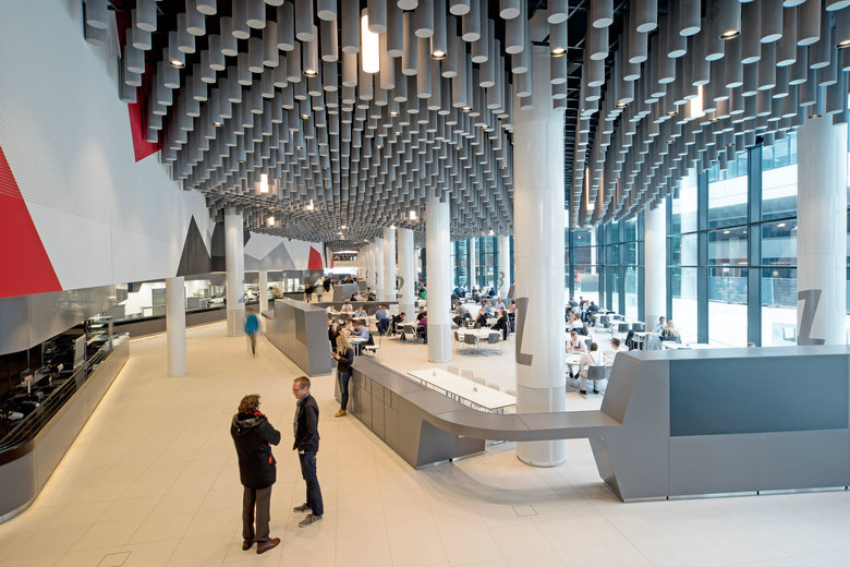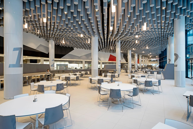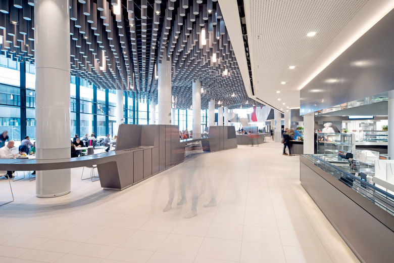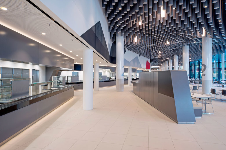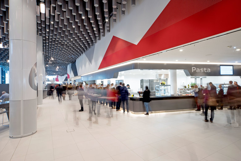 Gesunde, vollwertige Ernährung, die frisch zubereitet wird, steht im Vordergrund. So fiel die Entscheidung für eine bewusste Teilung der Restaurantfläche in fünf Ausgabestationen, mit einem vielfältigen Speisenangebot nach dem modernem „Front Cooking Konzept“. Dabei ist von Vorteil, dass die modernen Betriebsküchen durch kleinere und effektivere technische Geräte und effiziente Lieferketten weniger Fläche benötigen. Statt langer Warteschlangen können die Mitarbeiter sich nach individuellen Essenswünschen zu verschiedenen Ausgaben bewegen und verteilen sich selbst zu Stoßzeiten gut auf der Fläche. Die ganztägig geöffnete Work Lounge, mit Baristabar auf der Galerieebene, ist ein zusätzliches Raumangebot für die Mitarbeiter. Um diesen Bereich vom klassischen Kantinenmodus abzugrenzen, wurde eine andersartige Gestaltung in Form und Farbe gewählt. Auch das Mobiliar und die unterschiedlich gestalteten Rückzugsbereiche differenzieren sich deutlich vom Restaurantbereich. Dieses Ambiente lädt zum Verweilen ein und fördert die Kommunikation der Mitarbeiter untereinander.
