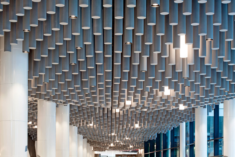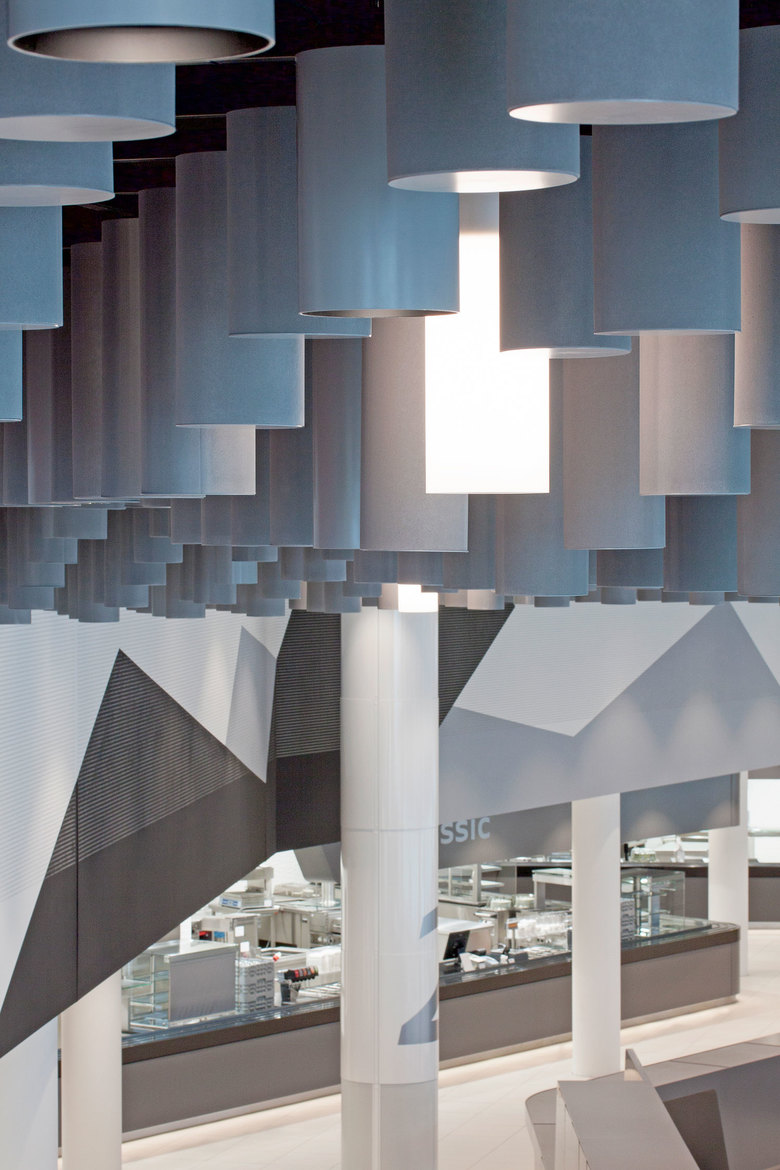 Die fließende Form des Raumes und die großzügige Raumhöhe von 7,50 Metern werden durch die lebendige Untersicht der dreidimensional geformten Akustikdecke unterstützt. Die abgehängten Akustikzylinder dienen nicht nur der Schallabsorption, um dem Anspruch einer angenehmen Akustik gerecht zu werden, sondern wirken zugleich optisch. Mit den in die Decke integrierten Spots und Pendelleuchten wird ein warmes, brillantes Licht auf die Tische gebracht. Großzügige Fensterflächen lassen viel Tageslicht ins Innere und schaffen zudem Transparenz.