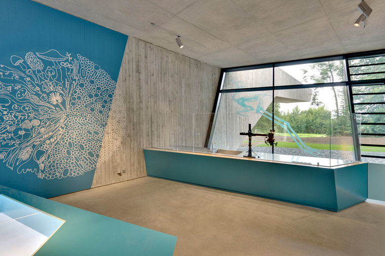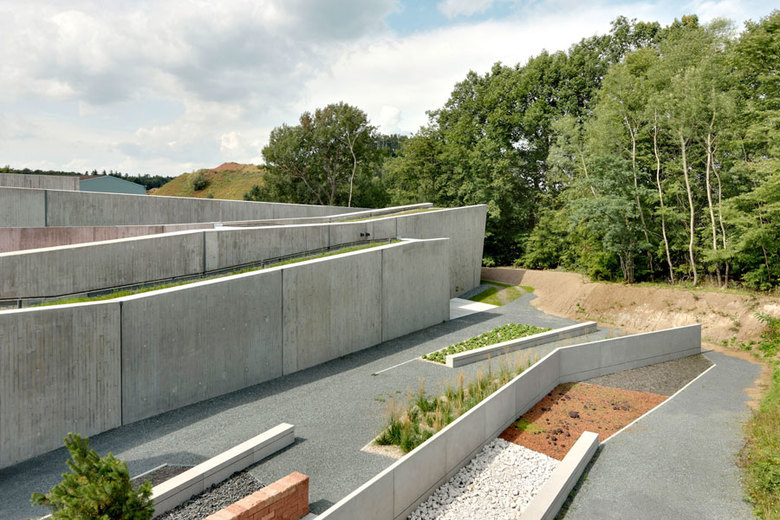 Die Landschaftsarchitektur und die Szenographie greifen das architektonische Konzept auf und unterstützen dieses. So werden im Themengarten und in den Außenanlagen vor Ort vorgefundene Materialien wie Ölschiefer, Ytong-Bruch oder Rückstände aus der Ölgewinnung in die Gestaltung integriert. Bis hin zur Verwendung von Pflanzen, welche die Anmutung der Grube in früherer Zeit bereits geprägt haben. Die Ausstellungsarchitektur intensiviert die Raum-Stimmungen durch Farbwahl und Materialität, sowie abwechslungsreich gestalteten Exponaten, die in enger Zusammenarbeit mit befreundeten Forschern und Wissenschaftlern speziell entwickelt wurden.