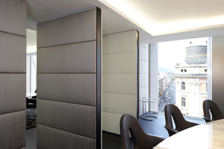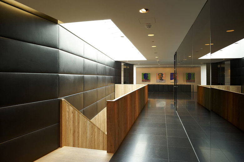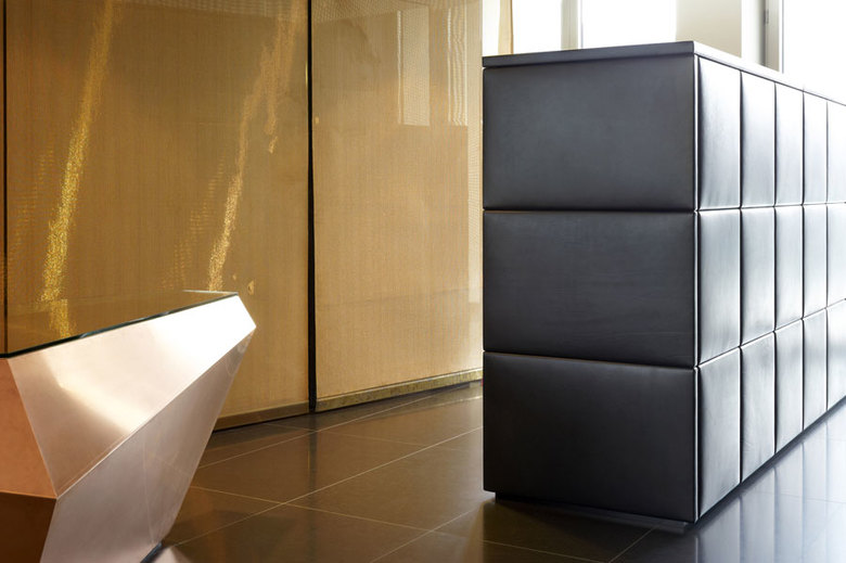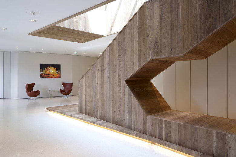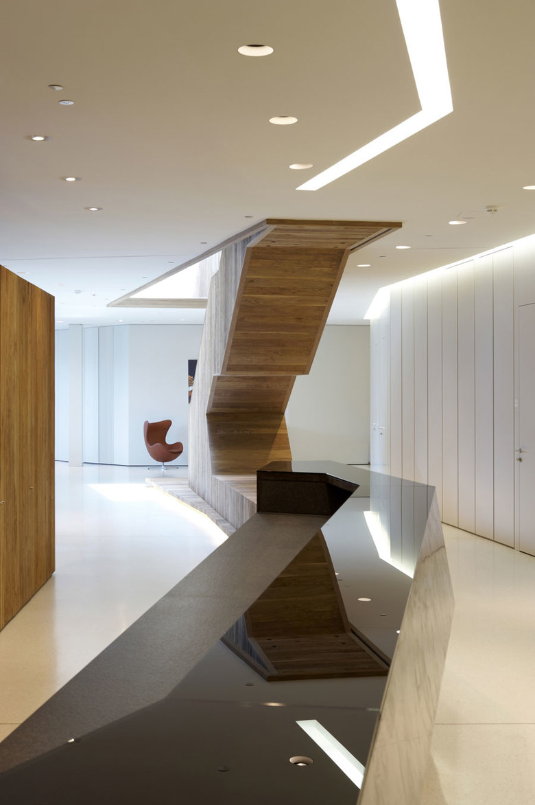Neben großzügigen Büroflächen und Konferenzbereichen können sich die Mitarbeiter in einer öffentlichen Lounge bei einem phantastischen Blick über Innsbruck entspannen. Eleganz und Understatement, gepaart mit einem ungewohnten Materialmix und akzentuierter Lichtführung komplettieren die außergewöhnliche Immobilie. Während sich in der unteren Ebene der Empfang, Kaffeebar und die Bürobereiche befinden, ist die obere Ebene den Geschäftsbeziehungen mit Besprechungsbereichen und Büro des Inhabers vorbehalten. Eine Aufteilung, die sich auch in der Farb- und Materialwahl widerspiegelt. Eine skulpturale Treppe aus gehacktem Tiroler Nussbaum als lokale Materialreferenz verbindet die beiden Funktionsbereiche optisch. Ihr Ausläufer bildet das markante Barelement aus, die zum kommunikativen Austausch einlädt. Terrazzoböden, edle Hölzer, mit Leder ausgeschlagene Wände und Möbel, feine Gewebe aus Textil und Metall sowie die präzise Verarbeitung der verschiedenen Materialien unterstreichen die klare und feine Eleganz der neuen Räumlichkeiten.