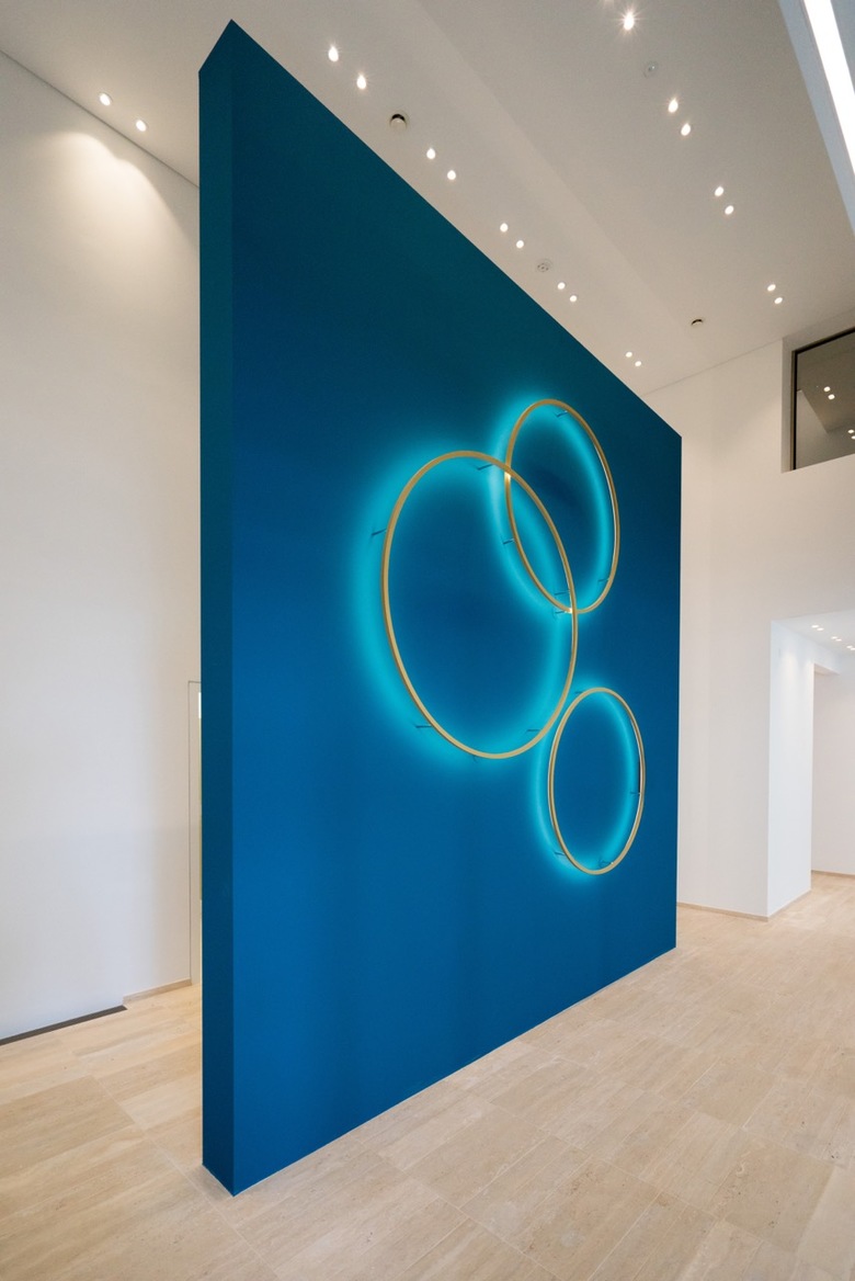 Landau + Kindelbacher wurden für das Interior Design einer Villa im exklusiven Ensemble Villa Eden in Gardone am Gardasee beauftragt. Die Lage der Villa an einem gewachsenen Olivenhain entlang des Hangrückens ermöglicht eine zentrale Terrassenlandschaft mit Pool. Der expressiven Architektur folgend, spiegelt das Interior Design die Eleganz und Exklusivität des Standorts mit sommerlichem Design wieder. Die kontrastreiche Farbpalette bedient sich traditioneller Anleihen: das Aquamarin des Gardasees, die lackierten Hölzer der eleganten Rivaboote sowie die zitronengelben Tupfer aus den umliegenden Zitronengärten.