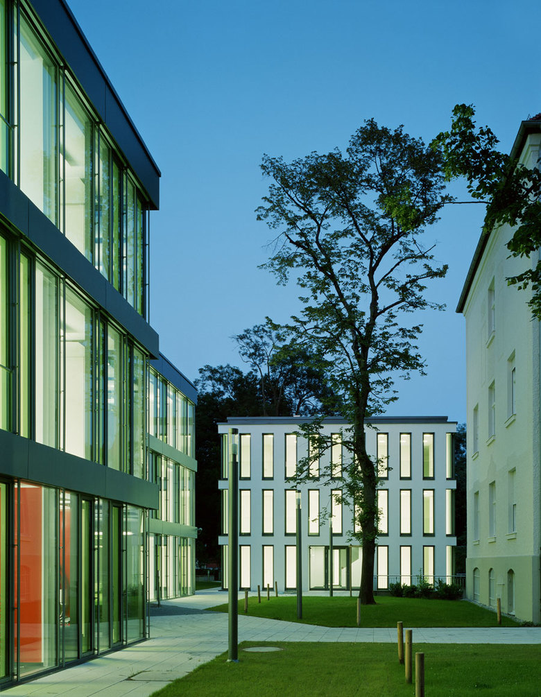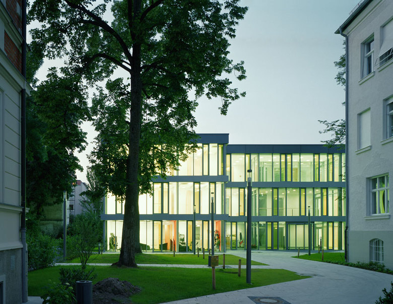 Bayerischer Dampfkessel- Revisions-Verein, so hieß im 19. Jahrhundert der Vorgänger des heutigen TÜV Süd; der Verein hat seine Ursprünge in einer repräsentativen Villa in München Schwabing. Im Hofbereich hinter dieser Villa entstand nun ein neues Bürogebäude, dessen charakteristische Form aus den Höhen und Kubaturen der umgebenden Bebauung unter maximaler Ausnutzung des Abstandsflächenrechtes generiert ist, sowie ein klar geschnittener Kubus mit drei Büroetagen. Beide Baukörper sind über ein gemeinsames Untergeschoss mit Tiefgarage verbunden. Die kompakte Nachverdichtung ermöglicht den Erhalt alter und sehr schöner Bäume auf dem Grundstück.