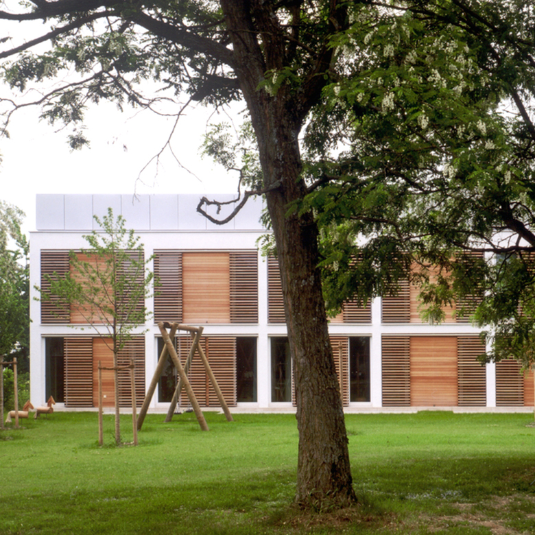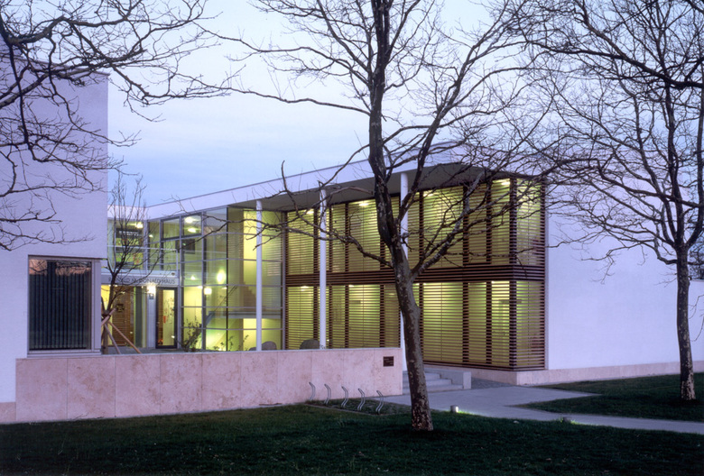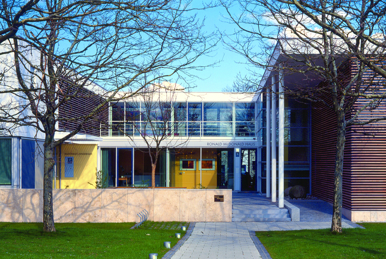 Im Ronald Mc Donald Haus auf dem Gelände des Universitätsklinikums Großhadern finden Angehörige schwer kranker Kinder eine zeitweilige Unterkunft, z.T. über mehrere Monate. Man betritt den U-förmigen Baukörper durch einen gepflasterten Innenhof, der bei gutem Wetter wie eine große Terrasse genutzt wird. Hier befinden sich auch ein Kinderpielplatz und Abstellmöglichkeiten für Fahhrräder. Als geschützter, halbprivater Außenraum bildet der Hof eine Pufferzone zu der nüchternen und sehr technisch wirkenden Umgebung des Klinikums. Im Erdgeschoss sind eine Gemeinschaftsküche, Ess- und Spielzimmer sowie Verwaltungsräume angeordnet. Der Aufgang ins Obergeschoss führt zu einem Gemeinschaftsraum mit Sonnenterrasse; von hier ist stets der - psychologisch wichtige - Blick zum Krankenhaus möglich. Die 14 Familienzimmer auf beiden Ebenen sind zu den umliegenden Grünflächen orientiert, was den Bewohnern ein Gefühl von Privatheit ermöglicht. Die Komposition der Materialien trägt entscheidend zu der ruhigen, persönlichen Atmosphäre bei, die im deutlichen Gegensatz zum institutionellen Charakter des Klinikums steht.