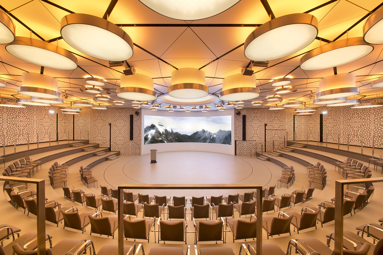 Herz des Projektes ist das für 300 Personen konzipierte Auditorium. Seine Wände sind mit Paneelen verkleidet, die aus gefrästem Corian gefertigt wurden. Alle Designdetails zielen darauf ab, einen Eindruck von Leichtigkeit und räumlicher Weite zu vermitteln und das Gefühl zu vermeiden, unter der Erde zu sein. Durch teilweise absenkbare Sitzreihen lässt sich der Raum individuell modifizieren. Der ‚wandelbare Raum‘ ist Auditorium, Konferenzsaal, Sitzungssaal, Veranstaltungssaal, Versammlungsort und Aufführungssaal in einem. Den entscheidenden Beitrag für das überwältigende Raumgefühl im Auditorium leistet jedoch die von einer programmierbaren Lichtsteuerung kontrollierte, hoch variable Beleuchtung.