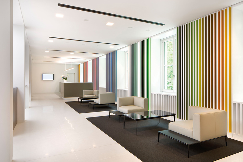 Die Allgemeinbeleuchtung des Erdgeschosses erfolgt gleichermaßen über quadratische Downlights, die bündig in die Decke eingebaut sind. Die Downlights sind mit LEDs bestückt, deren Technik es ermöglicht auf die im Tagesverlauf wechselnden Lichtfarben des einfallenden Tageslichtes adäquat zu reagieren. Im repräsentativen Lounge- und Wartebereich sorgt tagsüber eine frische, neutralweiße Lichtfarbe für eine passende Lichtstimmung, während bei Abendveranstaltungen eine warmweiße Lichtfarbe den Raum treffend in Szene setzt.