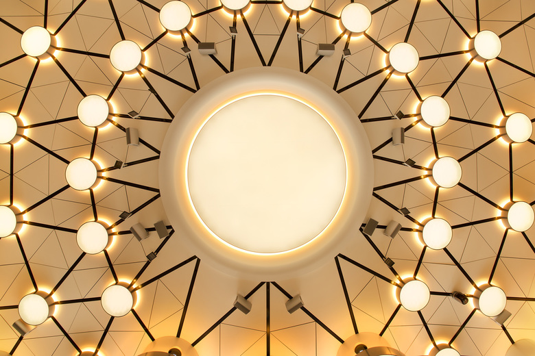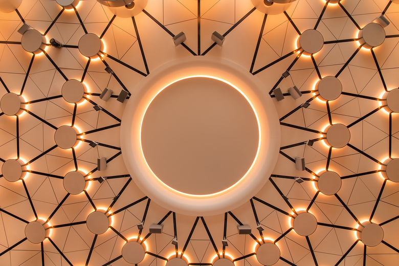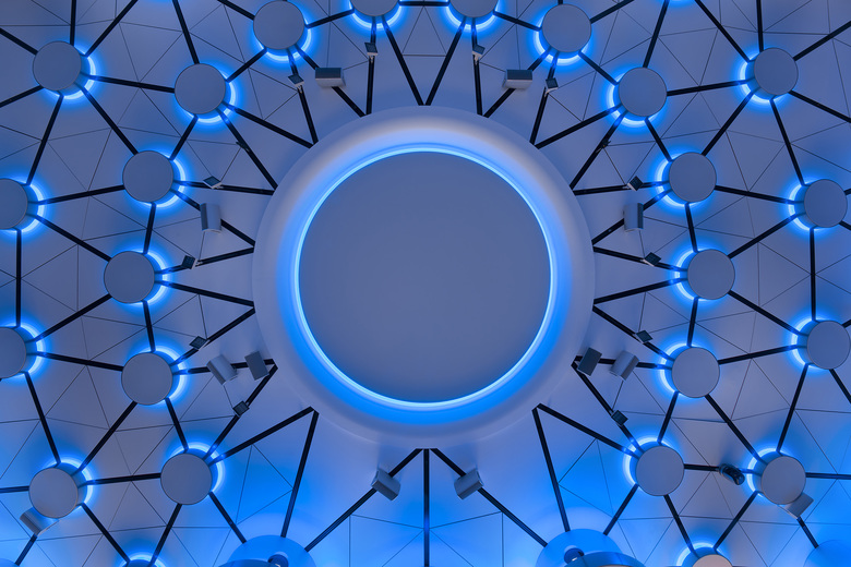 Zusätzlich zu dieser direkten Lichtkomponente können alle Leuchten über einen nicht direkt einsehbaren Ring aus RGB-LEDs den unmittelbaren Deckenraum um sich herum mit farbigen Licht aufhellen. Der Oculus befindet sich direkt über dem zentralen Vortragsbereich und verfügt über die gleiche LED-Technik wie die kleinen zylindrischen Leuchten, um direktes, weißes Licht in variabler Helligkeit und Farbtemperatur abzugeben.