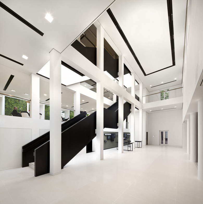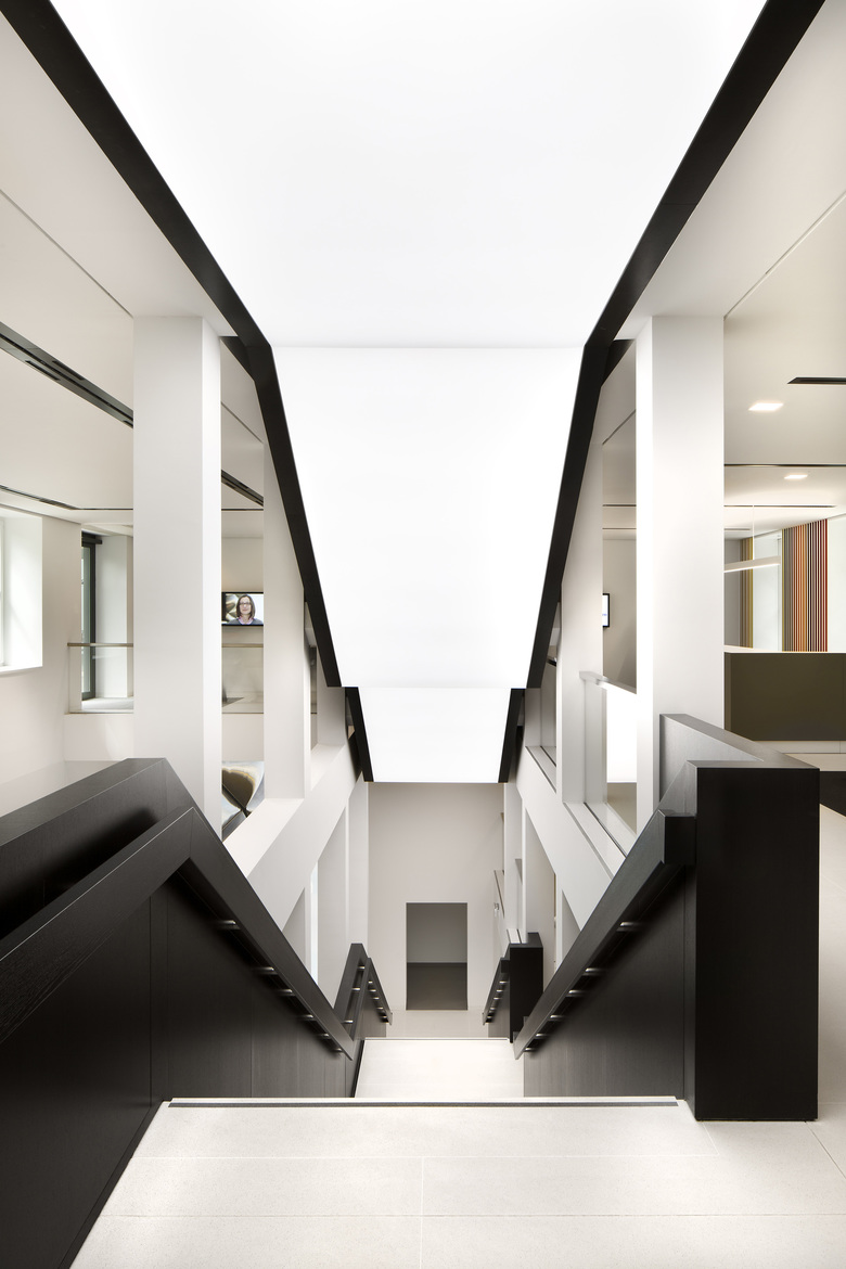 Das Konzept der variablen Lichtfarbe zieht sich auch durch die Planung weiterer Raumsituationen des Projektes: Im zweigeschossigen Atrium wurden schmale lineare Downlights in der Lüftungsschiene integriert und bringen druckvolles warmweißes und kaltweißes Licht auf den Boden. Die schwarze Treppe, die sich wie eine Skulptur durch die offengelegte Stützenstruktur des Atriums zieht, besitzt auf ihrer Unterseite eingelassene Folien-Lichtdecken – ebenfalls ausgestattet mit in ihrer Farbtemperatur dynamisch ansteuerbaren LEDs.