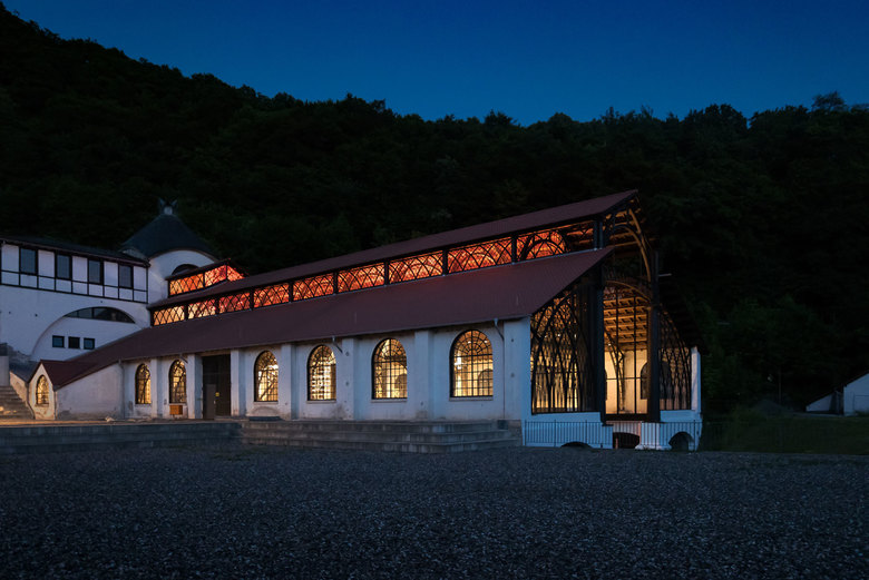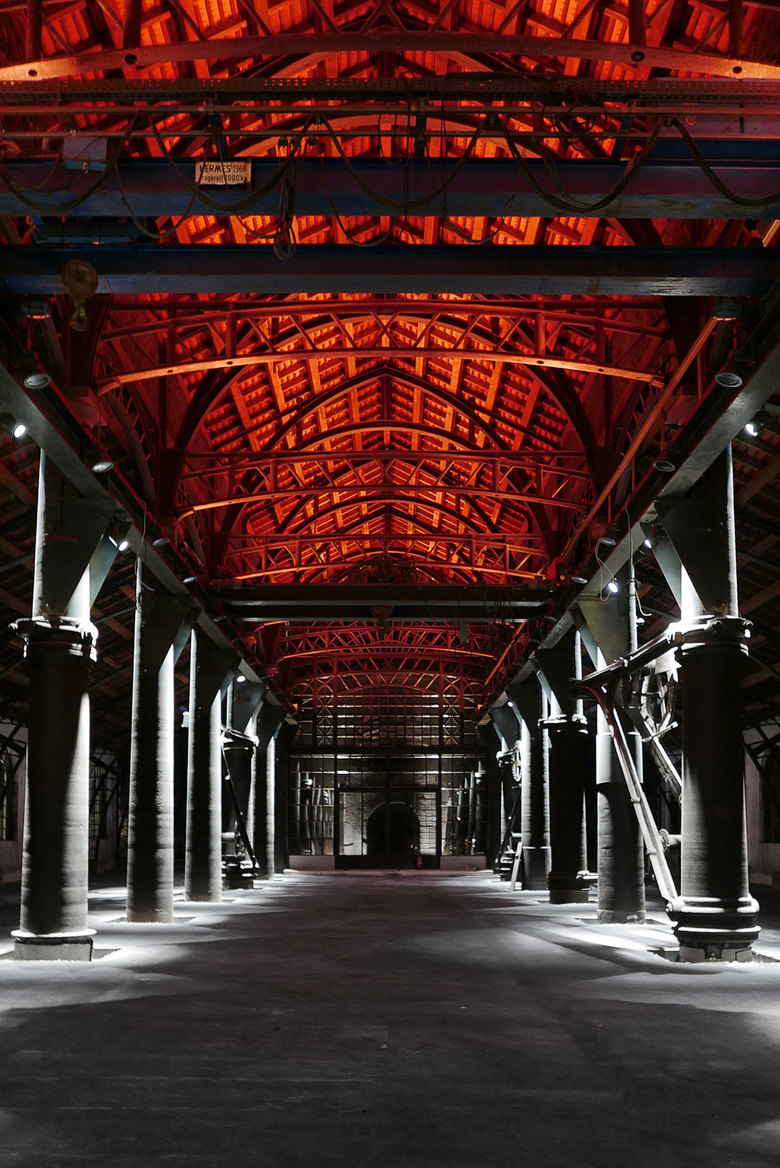 Um dem flexiblen Nutzungskonzept gerecht zu werden, hat Licht Kunst Licht eine Beleuchtung ausschließlich mit Led-Leuchten umgesetzt, die jedes Architekturelement einzeln betont und voll steuerbar ist. So werden differenzierte Lichtstimmungen angepasst an die momentane Nutzung erzeugt, die das nächtliche Gebäude nuanciert beleuchten. Der Blick von Aussen auf die gläserne Westfassade der Sayner Hütte führt in die Tiefe des Gebäudes, entlang des Weges der Eisenschmelze, bis hin zur Rückwand, die einst die Schmelzöfen enthielt. Die Beleuchtung unterstreicht die Leichtigkeit und Transparenz der basilikalen Bauform, lässt sie aus von innen heraus strahlen und kontrastiert sie so in der nächtlichen Ansicht gegen den Berg, aus dem das Eisen einst gewonnen wurde.