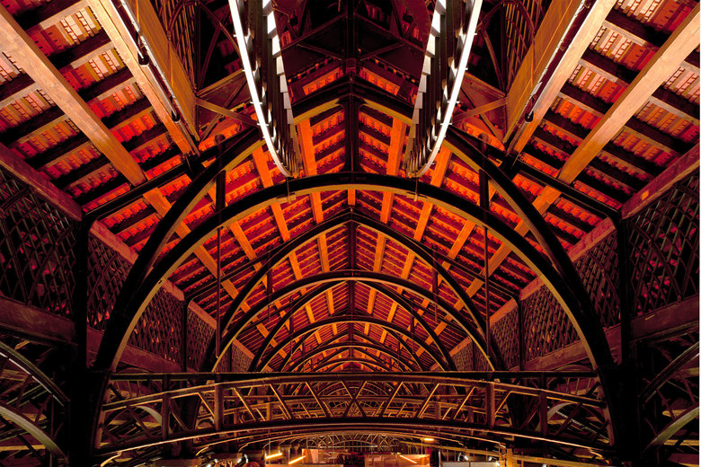 Im Inneren akzentuiert das Lichtkonzept die Architekturelemente einzeln und schafft so die Möglichkeit differenzierter Lichtkompositionen, ganz nach den Erfordernissen der jeweiligen Veranstaltung. Die Leuchten sind entlang einer horizontalen Ebene montiert, die die Längsausdehnung und Geometrie des Raumes betont, sowie sich dem formalen Kontrast zwischen den vertikalen Stützen des unteren Halbraumes und dem horizontalen Dachraum unterordnet. Im Zusammenspiel mit der Allgemeinbeleuchtung wirkt das Licht so gleichmäßig; die Gesamtatmosphäre öffnet sich dem Besucher, während das metaphorisch rote Dach eine formale Klammer bildet, die selbstverständlich auch in anderen Farben eingestellt werden kann.