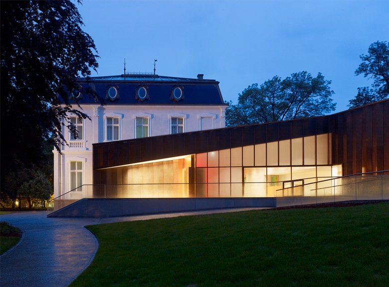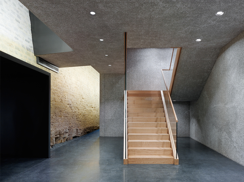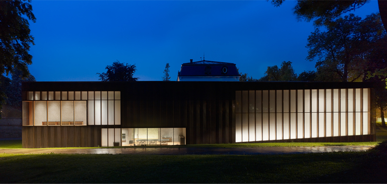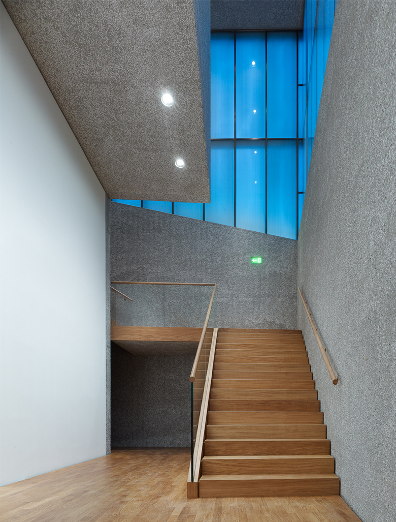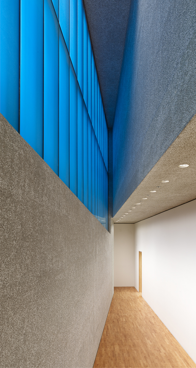 Im Gegensatz zu den Ausstellungssälen, in denen die diffuse Beleuchtung bewusst nicht den Raum konturiert, arbeiten Richtstrahler in den übrigen Bereichen Materialien, Formen und Texturen explizit heraus: aufgerauter Sichtbeton, auf dem kleine helle Quarze aufscheinen, weißer Feinputz und Eichenholz bestimmen die Ästhetik im Neubau. Über die Reflexion des Lichts auf den hellen Holzböden werden die Raumdecken eingeblendet und die Gebäudestruktur wird auch von außen ablesbar. Die unterschiedlichen Fassadenlayer aus Lochmetall, Verglasungen und opaken Flächen bilden im Ergebnis ein vielschichtiges Raster.