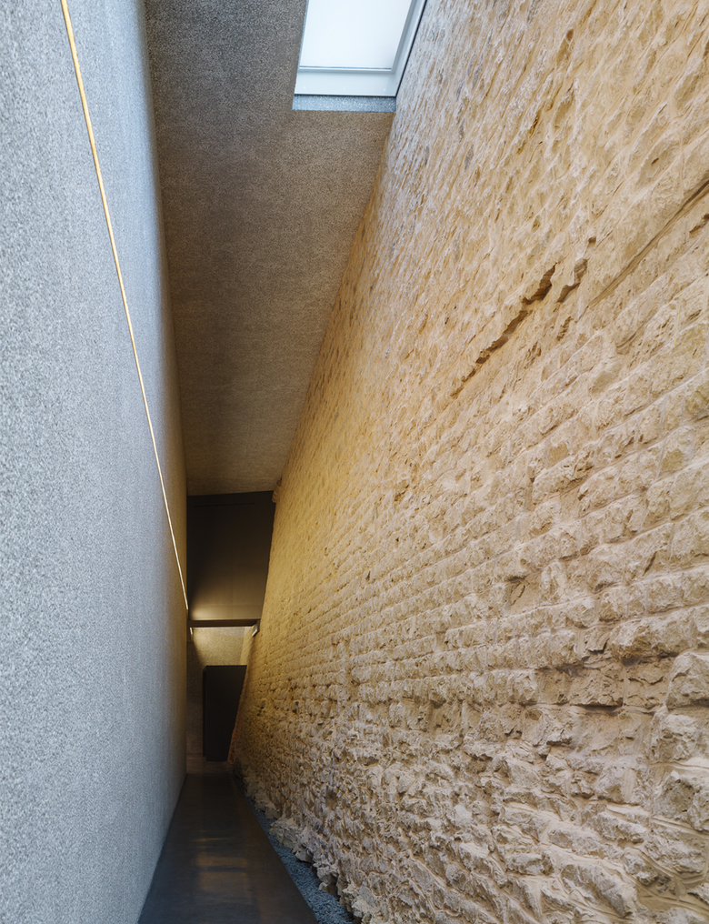 Eine schräg gestellte Deckenscheibe über dem Foyer wirkt in der Dunkelheit wie ein leuchtendes Segel und markiert unübersehbar das Entrée. Im Inneren des Gebäudes flankieren Downlights den weiteren Wegverlauf für den Besucher und sorgen für einfache Orientierung. Sie setzen einen besonderen Lichtakzent auf den Empfangstresen und blenden als Wallwasher die Rückwand des Kassenbereichs ein. Der Architekt hat einen Abschnitt der alten Festungsmauer als prominenten Bauteil in seine Planungen integriert. Indem auf halber Mauerhöhe Licht aus einer gegenüberliegenden Wandfuge einen warmen Schimmer auf das unregelmäßige Gefüge der Steine gibt, entsteht Dank dieser breit strahlenden Lichtquelle ein plastisches Spiel aus Licht und Schatten auf den Überresten der Festung.