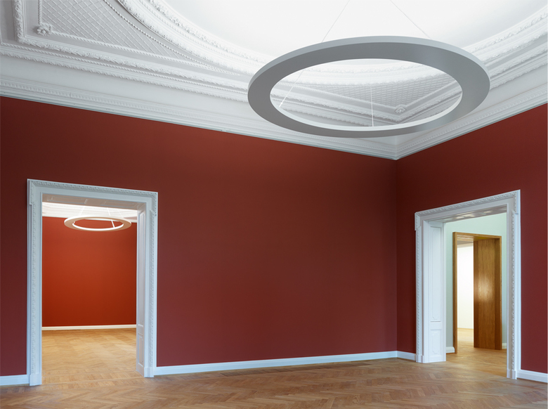 In anderer Ästhetik präsentieren sich die Räume in der historischen Villa. Sechs Ausstellungsräume mit unterschiedlichen Grundrissen zeigen das typische Interieur der Gründerzeit mit farbigen Wänden, Parkettböden und weißen Raumdecken. Für die beiden stuckbesetzten Bereiche im Erdgeschoss haben die Lichtplaner zwei großformatige Kronleuchterinterpretationen entworfen. Als ovale „Lichtbroschen“ sind sie, korrespondierend zur Stuckprofilierung, mittig unter der Decke abgependelt. Diese Leuchter füllen die Räume mit diffusem Licht und stellen in ihrer Lichtqualität einen Bezug zu den Lichtdecken im Neubau her. Lineare Lichtelemente beleuchten die verbleibenden vier Ausstellungssäle in der Villa. Ihre reduzierte Formensprache und rein indirekte Lichtabstrahlung halten den Raum frei von ablenkenden Details und rücken die präsentierte Kunst ins Zentrum der Wahrnehmung. Auch das Treppenhaus im Altbau hat seinen Villencharme bewahrt. Unter den teilweise mit Stuck besetzten Decken über den Treppenabsätzen und im Vorbereich des Aufzugs sind Anbau- und Pendelleuchten installiert.