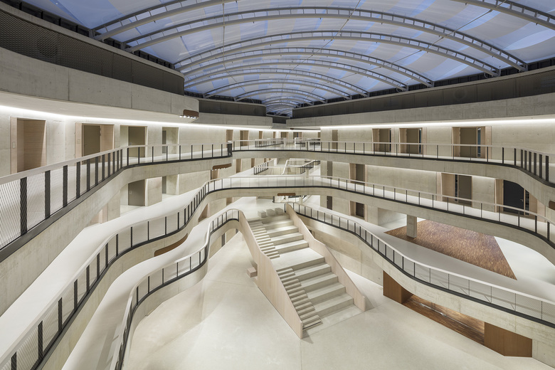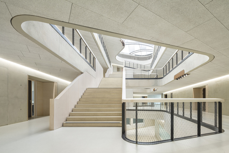 Dieses Atrium wurde auch zum Herzstück des Beleuchtungskonzeptes. Um die Vielschichtigkeit des Raums spürbar zu machen, wurden die Rückwände des Atriums mit durchlaufend montierten, verdeckten Streiflicht-Profilen eingeblendet. Die Randausbildung der Balustraden erhält in seinen organisch geformten Aussparungen sogenannte "Plomben", die justierbare Stromschienen-Richtstrahler aufnehmen. Aus den Öffnungen der Plomben heraus erhellen diese die Aula sowie die skulpturalen Treppen.