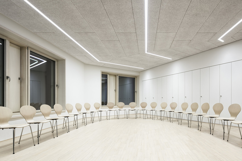 Sämtliche Klassenräume werden von durchlaufenden, schlanken Lichtlinien gleichmäßig und blendfrei beleuchtet. Diese folgen der Fassade in drei Spuren, die als räumlich gestaffelte Umrisse auch aus dem Außenraum ablesbar sind.
