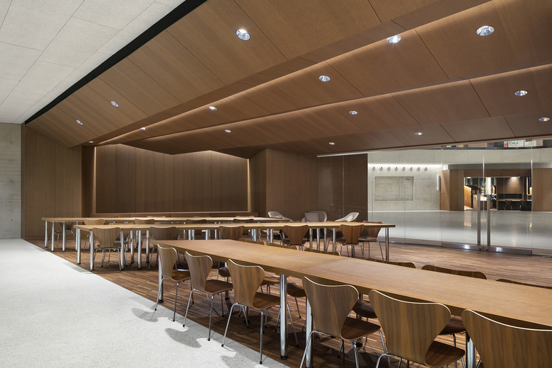 Die aufgefächerten Deckenfelder der Cafeteria sind an den Nahtstellen mit einem Hauch von Licht optisch voneinander abgelöst. Eine Sitznische ist mit Streiflicht in besonderer Weise herausgearbeitet. Die restliche Beleuchtung des Raumes erfolgt aus Einbaurichtstrahlern, die konzentriertes, brillantes Licht auf die Cafétische aufbringen.