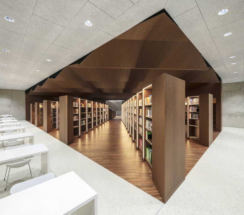 In der Bibliothek erfolgt die vom Innenarchitekturbüro Keggenhoff geplante Regal-Beleuchtung gänzlich aus der Möblierung heraus. Erst im Randbereich, entlang der großzügigen Fassadenverglasung, erfolgt die Ausleuchtung der Leseplätze wieder aus Downlights und Tischleuchten.