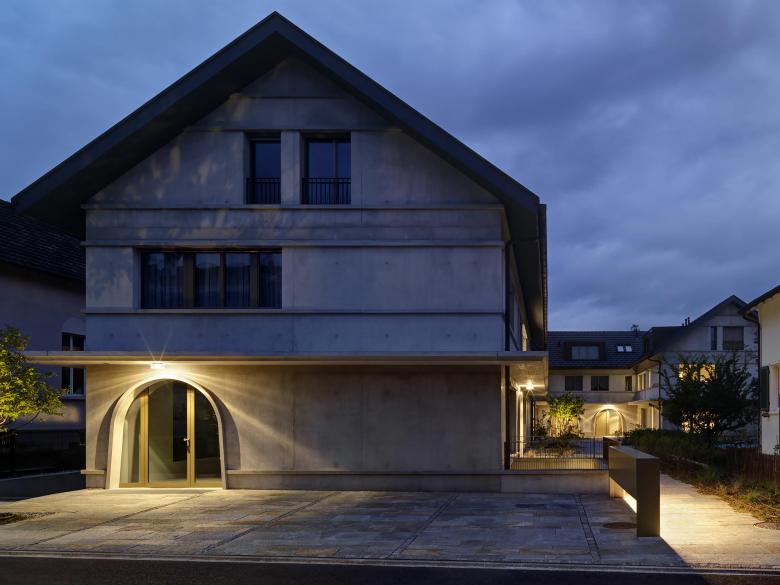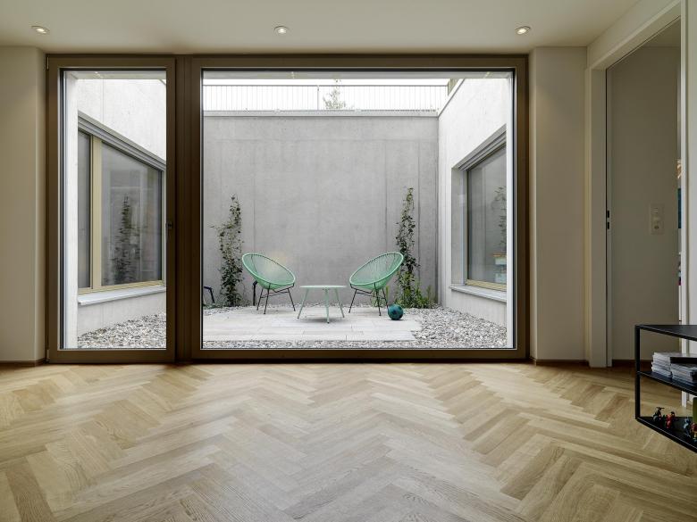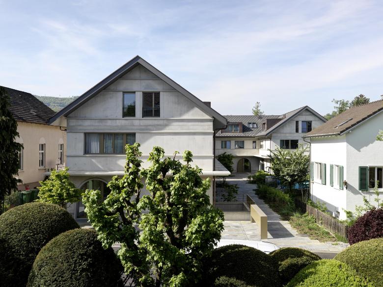 Die beiden Mehrfamilienhäuser an Zentrumslage verfügen über zwei Stockwerke mit Satteldach und Lichthofwohnungen im Untergeschoss.