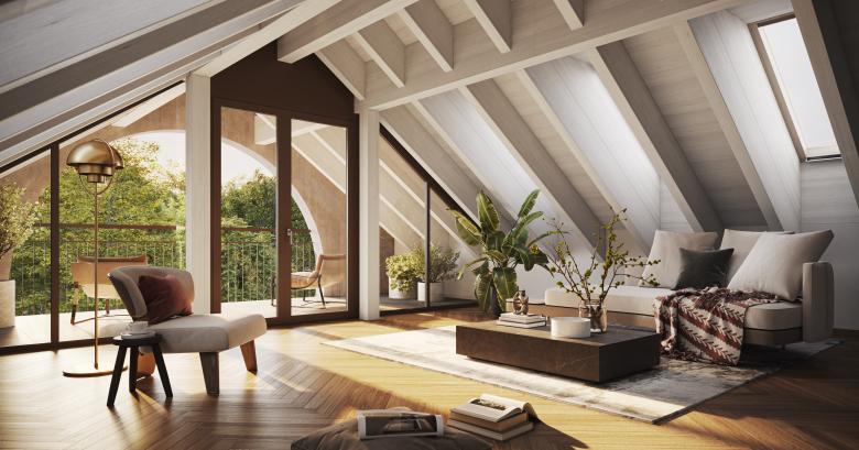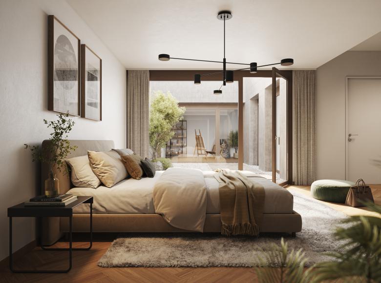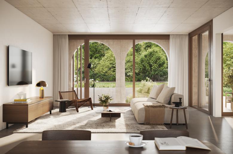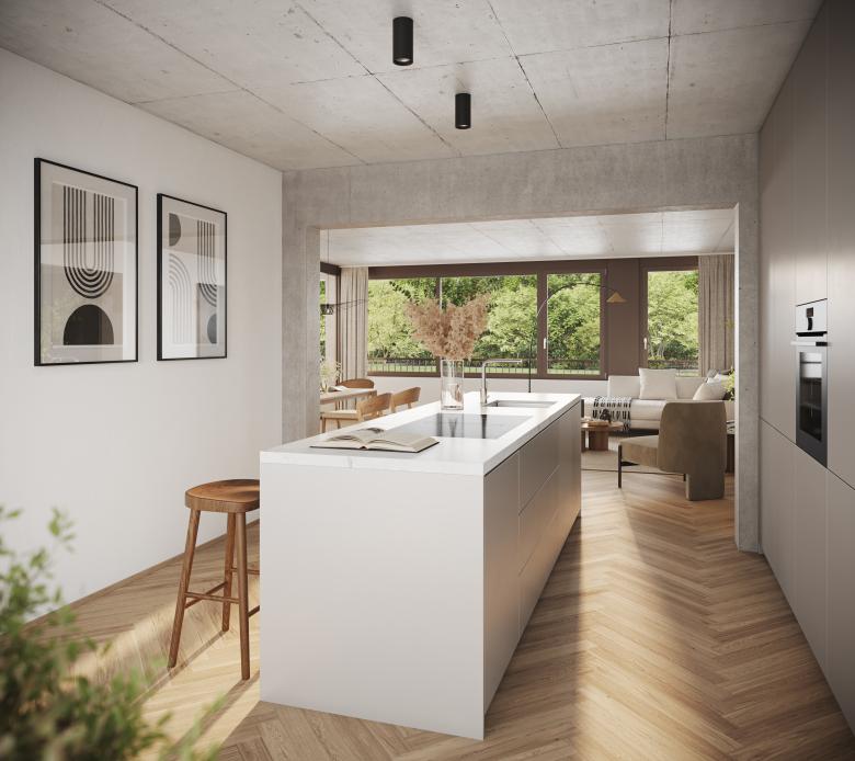 Die Zufahrt mit dem Auto erfolgt bequem über die Tiefgarage, während das Erdgeschoss bewusst autofrei gestaltet wurde, um den drei Einzelgebäuden einen dörflichen Charakter zu verleihen und den Bewohnern einen Raum für Begegnung in stilvoll gestalteter Umgebung zu bieten.
