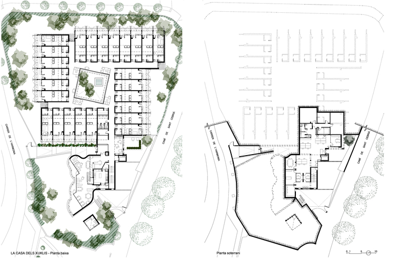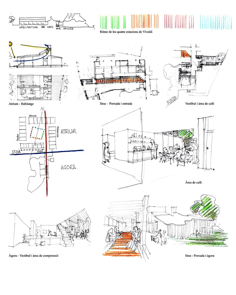La Casa dels Xuklis is a building designed to accommodate families with children diagnosed with cancer who live too far away of the city and receives treatment in Barcelona. It is a pioneering project in Europe led by the Fundació Privada de Nenes i Nens amb Càncer and born of an initiative by the Associació de Familiars i Amics de Nens Oncològics de Catalunya (AFANOC). The Maggie’s Centres in Scotland inspired the project, but La Casa dels Xuklis goes one step further adding a ground-floor patio-residence in a garden next to the Paediatric Oncology department of the Hospital de la Vall d’Hebron, a leading cancer hospital for Spain, Northern Africa, Eastern Europe and South America. MBM Architects strived to combine the different programmatic elements within a humanistic architecture. The design of this project reflects a new direction, both medical and psychosocial, that also addresses the needs of careers. The residence has 25 homes of 30 m2 each, grouped into four pavilions that are identified with the four seasons: spring, summer, autumn and winter. These pavilions are organized around a typical Mediterranean courtyard. Each apartment is prepared to accommodate a family and is equipped with an articulated pitched roof that facilitates cross ventilation so as to save energy and keep the ill safe from air conditioning hazards. An independent day-pavilion has been built in the southern area of the site. There, non-resident families can enjoy a domestic space to relax and socialize. This building has also common areas like a kitchen, a dining room, a library, a game room and a vegetable garden. ”Health depends on a state of balance…a balance that, at the same time, is achieved daily when one lives in harmony with the environment” Hippocrates Considering the social plurality of users, the design of the building is based on the symbolic forms belonging to the basic discipline of architecture related to the “coexistence”. There are three: first is the Atrium – an open courtyard around which are organized the four pavilions with 25 small homes, meant to be secluded spaces for the patients and their families –; second is the Stoa – the porch on the south side, which is a space where residents can stay, think and converse calmlyn–; and third is the Agora – the south pavilion, which is a common space designed as a meeting point between residents, families, visitors and caregivers. An altruistic group of 30 designers coordinated by Casa Décor, have collaborated on the interior design of La Casa dels Xuklis. The design is simple and naturalistic. It integrates a critical understanding of the mood necessary to accompany the pain of the situation. Coexistence and the environment have been closely related concepts used by architects and interior designers. The materials and furnishings used are highly hygienic.