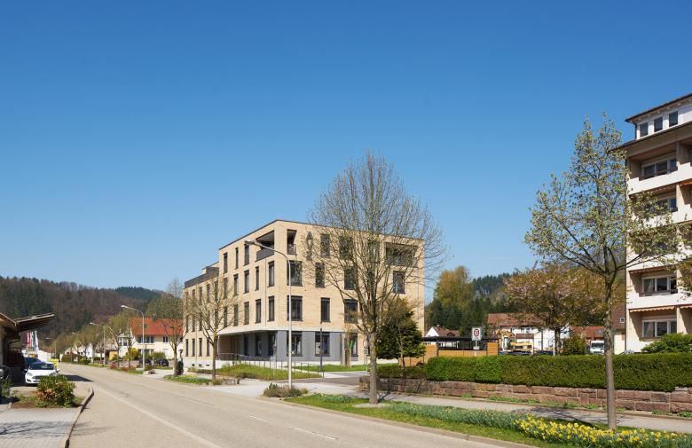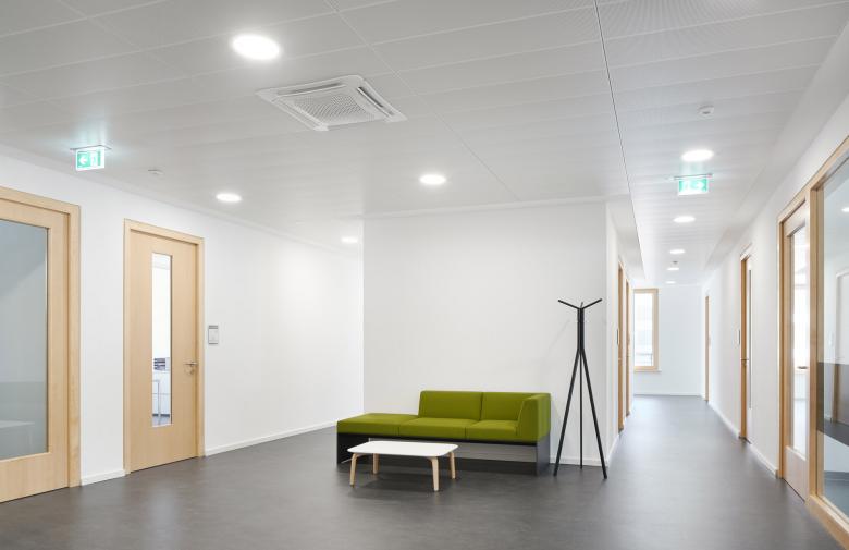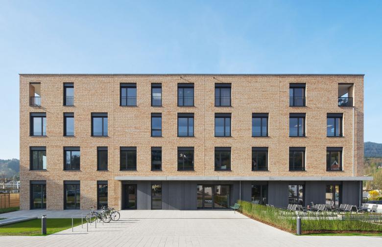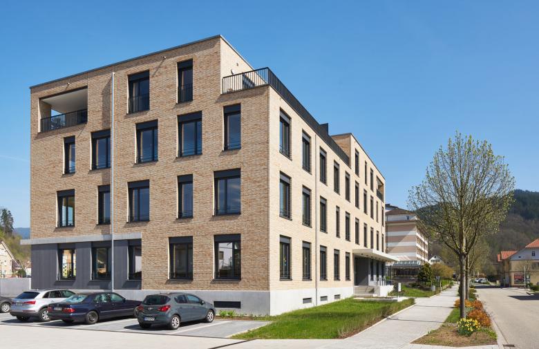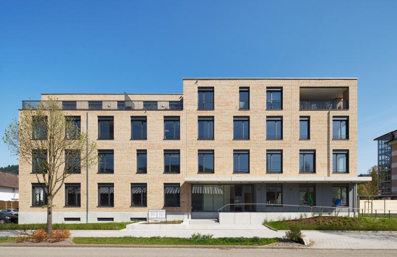 Das neue Mehrzweckgebäude ist eine Erweiterung des Vincentius Alten- und Pflegeheimes, in dem Räume für Tagespflege, Verwaltung, Arztpraxen und im Dachgeschoss barrierefreie Wohnungen Platz finden. In seinen Dimensionen vermittelt der viergeschossige Bau zwischen dem großen Vincentius-Haus und der sonst kleinteiligen Bebauung. Der grüne Vorbereich schafft einen Puffer zur Bahnhofstraße und nimmt die Flucht der angrenzenden Gebäude auf. Der rückwärtige Bereich lässt eine gute Anbindung zum Ortszentrum zu. Die Klinker-Fassade ist klar und zurückhaltend, versursacht wenig Folgekosten und schafft eine warme, freundliche Atmosphäre. Diese setzt sich im Innenbereich mit viel Weiß und hellem Holz fort. Große, weit herunterreichende Fenster ermöglichen den Ausblick für Menschen im Rollstuhl.