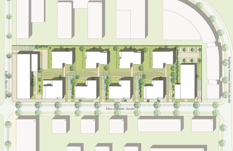 Die städtebauliche Idee für das Güterbahngelände ist eine funktionsgemischte Stadt. Diese Leitidee wurde bei den 10 geplanten und teilweise realisierten Gebäuden übernommen. In den geschützteren hinteren Bereichen befinden sich reine Wohnhäuser. An den Straßen befinden sich im Erdgeschoß verschiedene gewerbliche Nutzungen und in den Obergeschoßen Wohnungen. Das Gebäude am nördlichen Ende ist ein Büro- und Forschungsgebäude. Als Auftakt entsteht ein Bürogebäude mit Co-Working Räumen im Erdgeschoß.