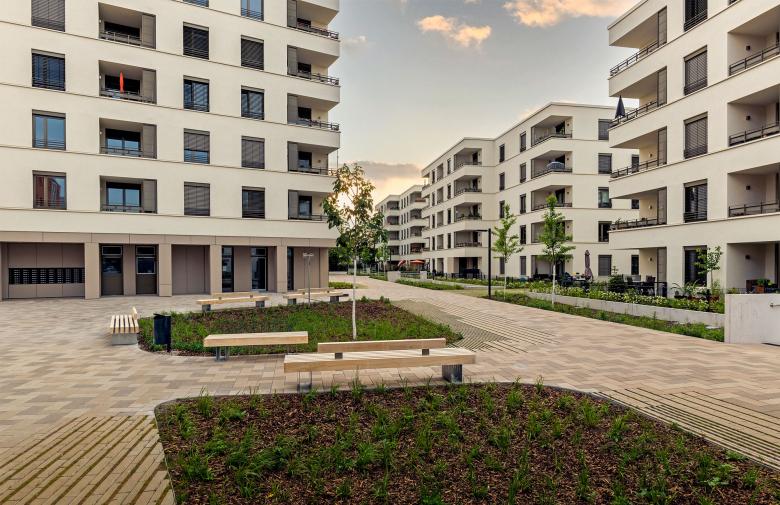 In vier 5-geschossigen und einem 8-geschossigen Gebäude werden 159 flächenoptimierte Wohnungen, eine Kita, ein Gemeinschaftsraum und ein „Wasch-Café" realisiert. Alle Baukörper sind über einen Versatz gegliedert, der sich aus den Vorgaben des Bebauungsplanes für ein Gebäude ergab und dann als Grundthema für alle Gebäude übernommen wurde. Die Stellung der Baukörper definiert einen zentralen Bewohnertreffpunkt. Vorhandene große Bäume werden in eine gefasste Pflanzinsel mit Sitzmöglichkeit integriert. Die Wohnungen sind alle so konzipiert, dass diese auch bei körperlichen Einschränkungen langfristig genutzt werden können. Die Häuser entsprechen dem KFW 50 Energiestandard. Eine Zertifizierung nach dem DGNB Gold Standard wird angestrebt.