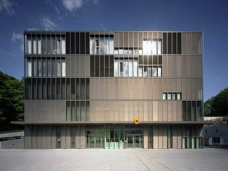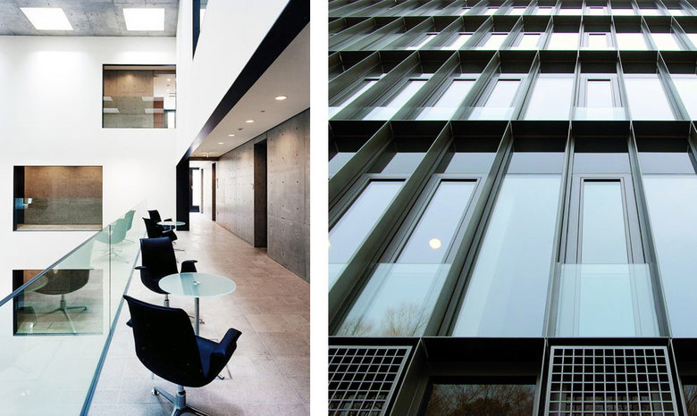 das Bestreben nach Offenheit und Benutzerfreundlichkeit. Die Fassadenkonstruktion nimmt den notwendigen außen liegenden Sonnenschutz auf. Der räumliche Abschluss erfolgt mit großflächigen Verglasungen in Aluminium-
