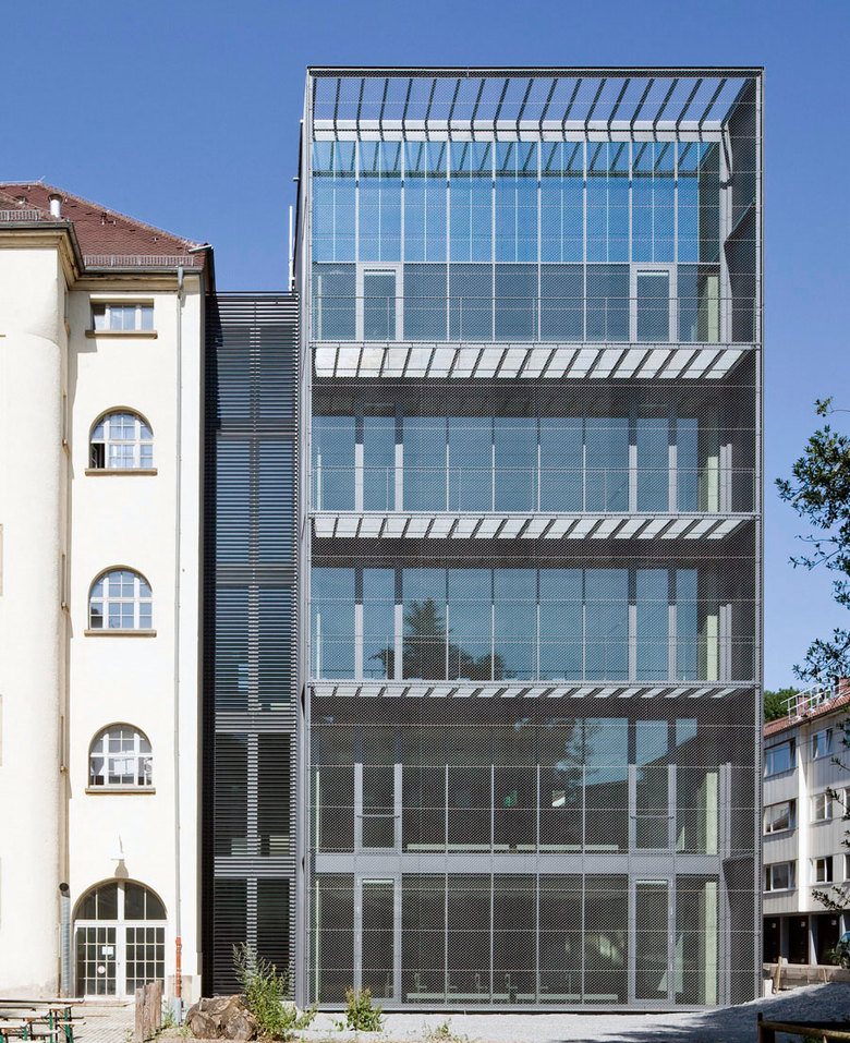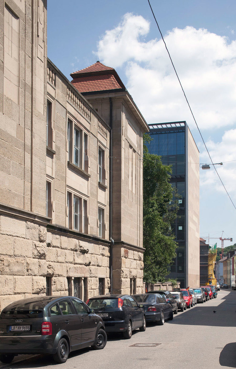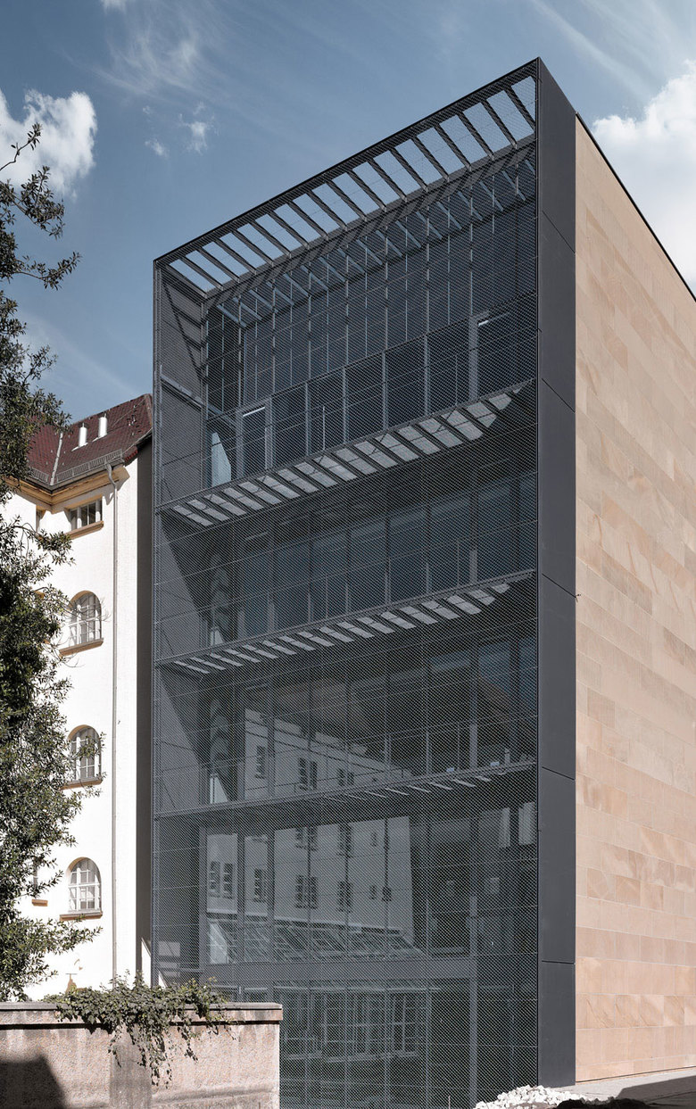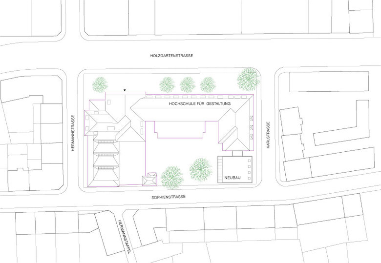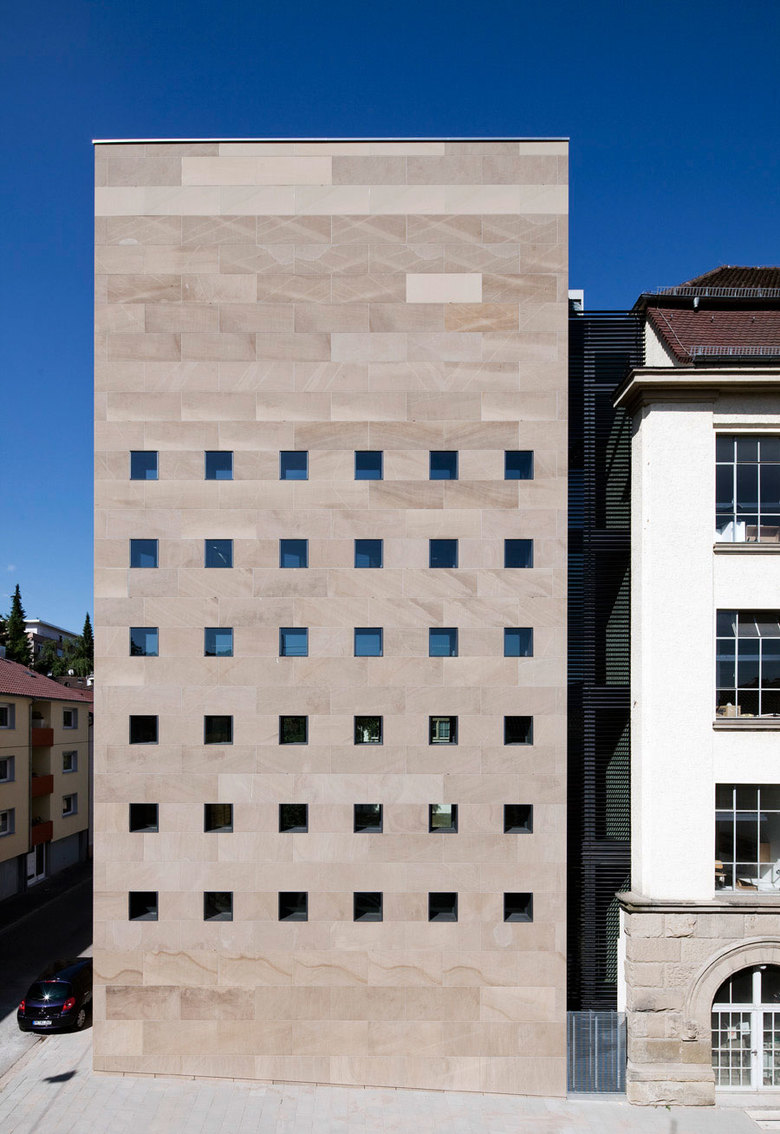 Der Erweiterungsbau in der Holzgartenstraße 36 bildet den baulichen Abschluss der bestehenden dreiflügligen Anlage der Fakultät für Gestaltung aus dem Jahr 1911. Der u-förmige Grundriss des Neubaus öffnet sich transparent zum Hof und bildet einen massiv geschlossenen Rücken zur Straße. Das zurückgesetzte Treppenhaus verbindet beide Bauten. Die Materialität des 6- geschossigen Baukörpers nimmt Bezug auf den Bestand. Sandstein, Stahl und Glas strukturieren die Fassaden des Gebäudes. Die rückwärtige Sandsteinfassade gliedert sich durch kleinteilige Kastenfenster und betont die Massivität der Konstruktion aus Ortbeton. Die Glasfassade zum Hof formuliert einen spannungsvollen Kontrast zum Bestand. Eine vorgelagerte Loggia vermittelt zwischen dem Innenraum und dem Hof. Die klare geometrische Gestalt des Neubaus ergänzt in seiner gestalterischen Zurückhaltung das historische Ensemble selbstbewusst und vervollständigt die Anlage.