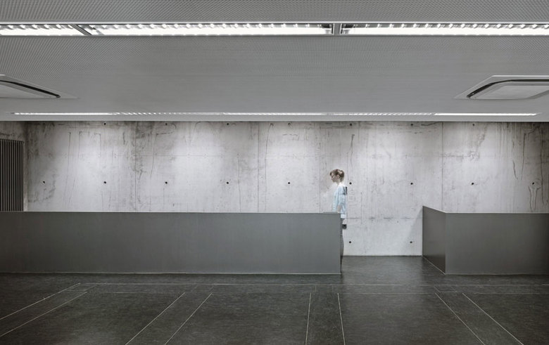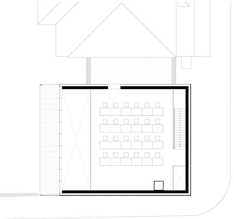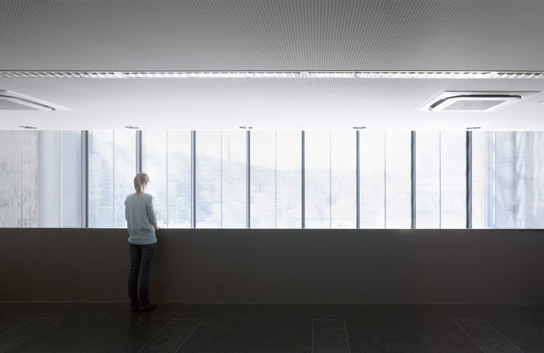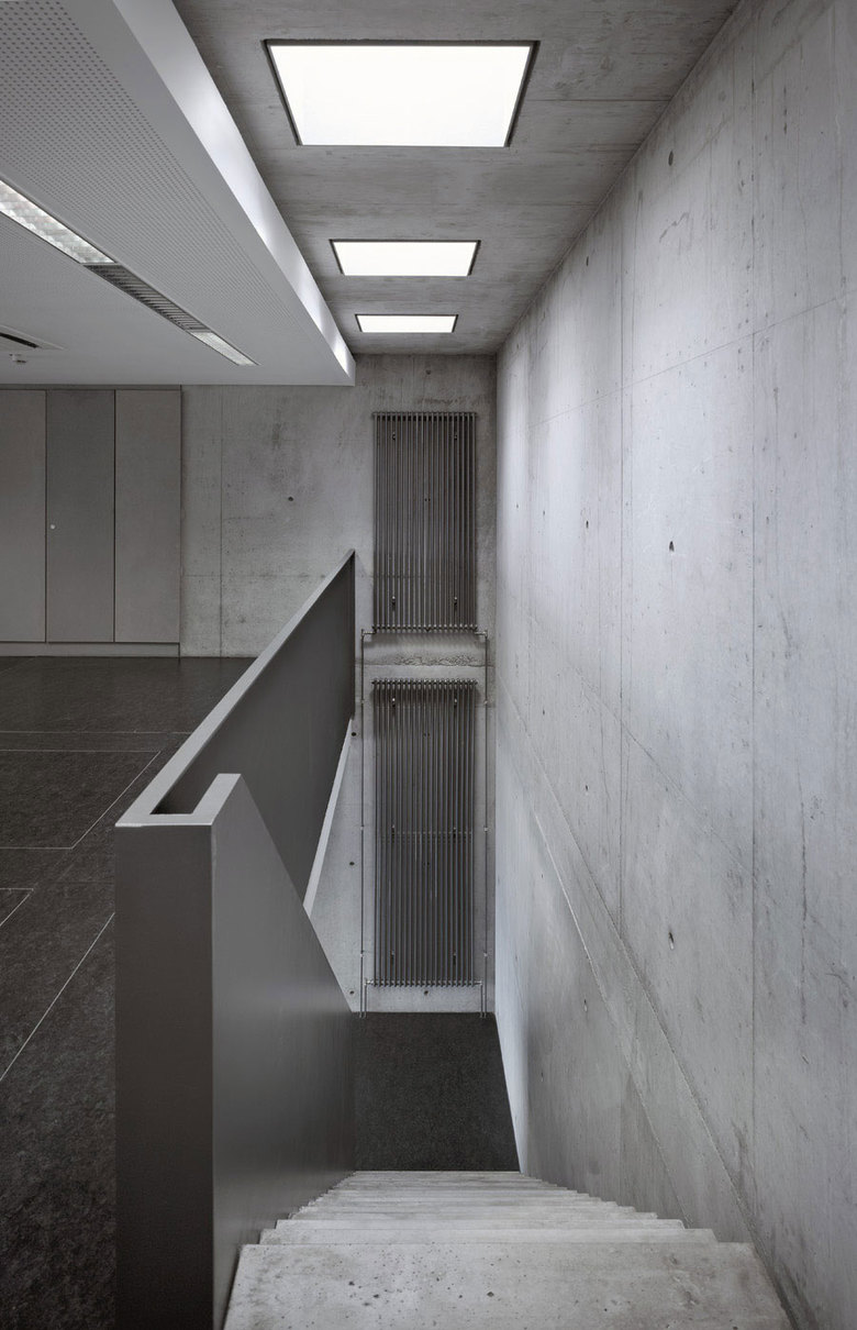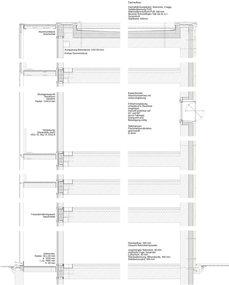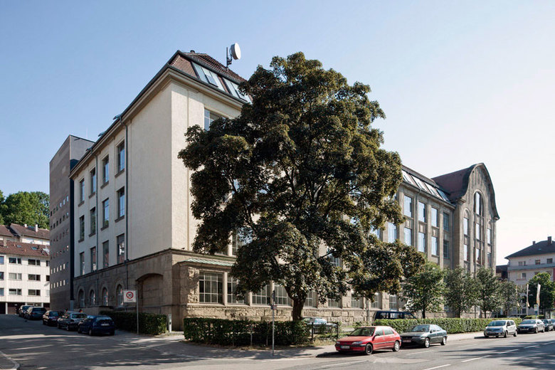 Der Erweiterungsbau in der Holzgartenstraße 36 bildet den baulichen Abschluss der bestehenden dreiflügligen Anlage der Fakultät für Gestaltung aus dem Jahr 1911. Der u-förmige Grundriss des Neubaus öffnet sich transparent zum Hof und bildet einen massiv geschlossenen Rücken zur Straße. Das zurückgesetzte Treppenhaus verbindet beide Bauten. Die Materialität des 6- geschossigen Baukörpers nimmt Bezug auf den Bestand. Sandstein, Stahl und Glas strukturieren die Fassaden des Gebäudes. Die rückwärtige Sandsteinfassade gliedert sich durch kleinteilige Kastenfenster und betont die Massivität der Konstruktion aus Ortbeton. Die Glasfassade zum Hof formuliert einen spannungsvollen Kontrast zum Bestand. Eine vorgelagerte Loggia vermittelt zwischen dem Innenraum und dem Hof. Die klare geometrische Gestalt des Neubaus ergänzt in seiner gestalterischen Zurückhaltung das historische Ensemble selbstbewusst und vervollständigt die Anlage.