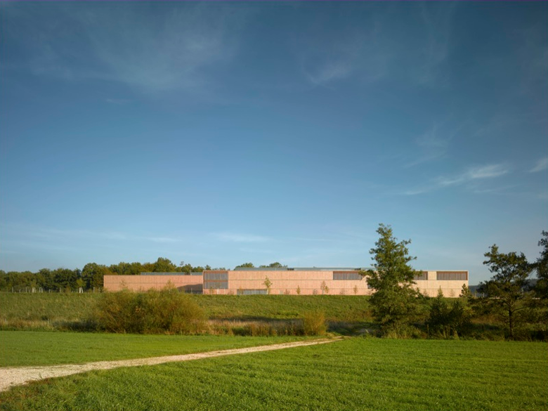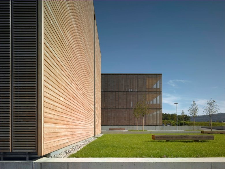 Die von weitem wahrnehmbare Komposition aus hellen und dunklen Bereichen der Gebäudeoberflächen entpuppt sich als dichtes Kleid aus Holzstäben, das den völlig verglasten Bau umhüllt. Gebaut in Lärche, nehmen die hölzernen Fassadenelemente bezug auf den angrenzenden Wald. Je nach Sonnenstand ändert sich das Fassadenbild. In geschlossenem Zustand bilden die aus unbehandeltem Lärchenholz gefügten lamellenartigen Fassadenelemente eine helle rötlich schimmernde Fläche. Wenn sich die Drehläden raumweise motorisch öffnen, wird die dahinter liegende dunklere Fläche der Verglasung sichtbar, und die vorstehenden Kanten der Läden erzeugen ein kräftiges Relief. Völlig geschlossen sind die holzverkleideten Schmalseiten, bei denen jedoch ein das Gebäude funktional gliedernder Einschnitt die innere Struktur der Bauten andeutet. Nichts soll die Ruhe der großen Formen stören. Die Gestaltung der Innenräume ist bewusst auf das Wesentliche beschränkt. Das sich von dem Weiß der Trennwände absetzende Sichtbeton der Decken und den statisch relevanten Wänden sowie die Bodenbeläge aus anthrazitgrauem Linoleum und Naturstein aus der Region, kontrastieren mit dem warmen Ton der hölzernen Lamellen, die sich aussen vor den raumhohen Verglasungen ausbreiten.