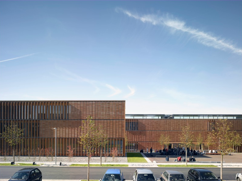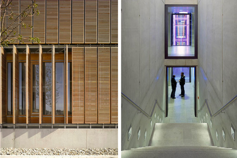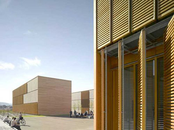 Drei schlanke Baukörper, zwei größere und ein kleinerer, wurden parallel zueinander in den leicht abfallenden Hang gesetzt. Über den zentralen Campusplatz gelangt man in die baumbestandene Erschließungsachse: ein betont urbaner Mittelpunkt der Gebäudegruppe, der als Kern einer kleinen „ Stadt der Wissenschaft“ verstanden werden kann, die im Laufe der Jahre wachsen wird.