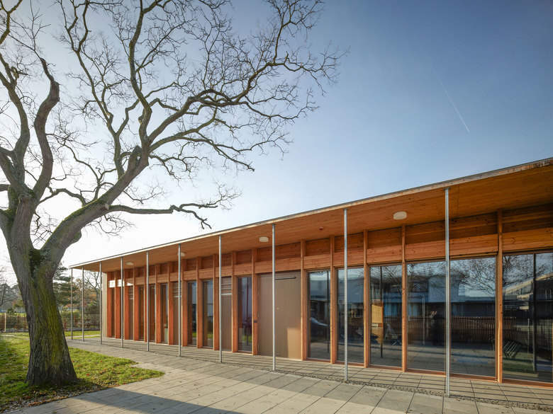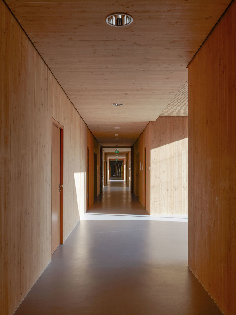 Massive Holzwände im Inneren tragen die vorgefertigten Dachelemente aus Holz und verleihen den Räumen eine ehrliche und natürliche Atmosphäre. Die Orientierung der Grppen zu den Höfen mit heschosshohen Glaselementen erweitert die Aufenthaltsräume bis in die Höfe und schafft so ein großzügiges Raumerlebnis.