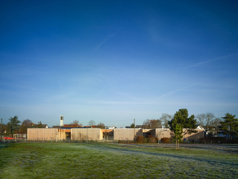 Das Zimmer im Grünen – Die eingeschossige Kita befindet sich am Süd-Ost-Rand von Frankfurt in Schwanheim und hat Raum für sechs Gruppen. Im Vorbeifahen wirkt die rhythmisch gegliederte Fassade wie die benachbarte Wohnbebauung, kleinteilig und zurückhalted. Die Erschließung erfolgt von Osten über die Straße Zur Waldau. Dieser Eingangsbereich ist geprägt von zwei großen Bestandsbäumen. Das Gebäude mit dem homogenen Holzkleid fügt sich mühelos in die Umgebung ein. Die rhythmische Gliederung des Volumens durch die eingeschnittenen Höfe verzahnt das Haus mit der umgebenden Landschaft und die HAus- und Hof-Abschnitte erhalten angemessenen, kindgerechte Proportionen. Jeder Gruppe ist ein direkten Außenraum zugeordnet, ein Zimmer im Grünen. Die Krippenkinder können sich dadurch innen und außen bewegen und sind durch die raumhohe Verglasung immer im Blickbereich der betreuenden Personen.
