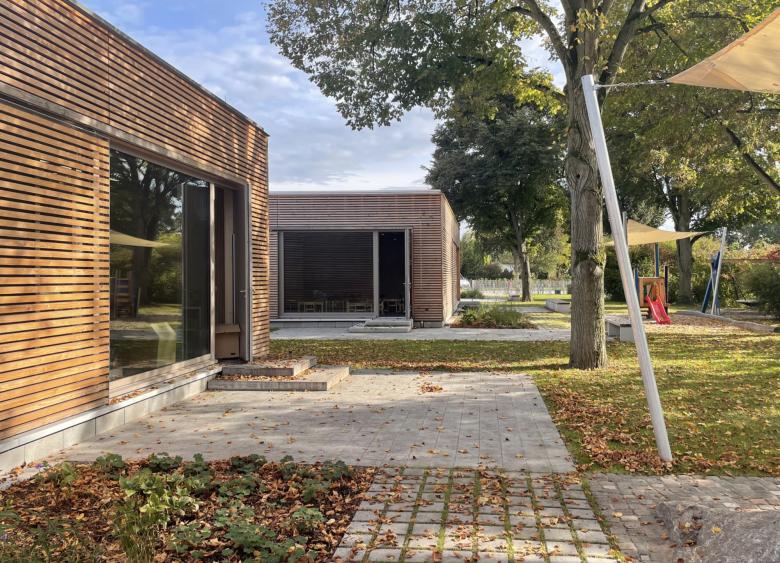 Holz ist als nachwachsender Rohstoff und aufgrund seiner schönen und angenehmen Oberfläche ein geeignetes und angemessenes Material für die Kita Edingen-Neckarhausen.