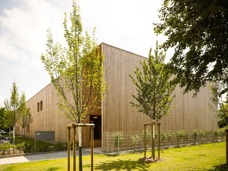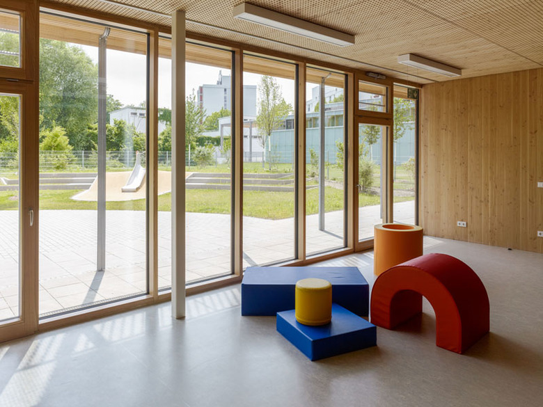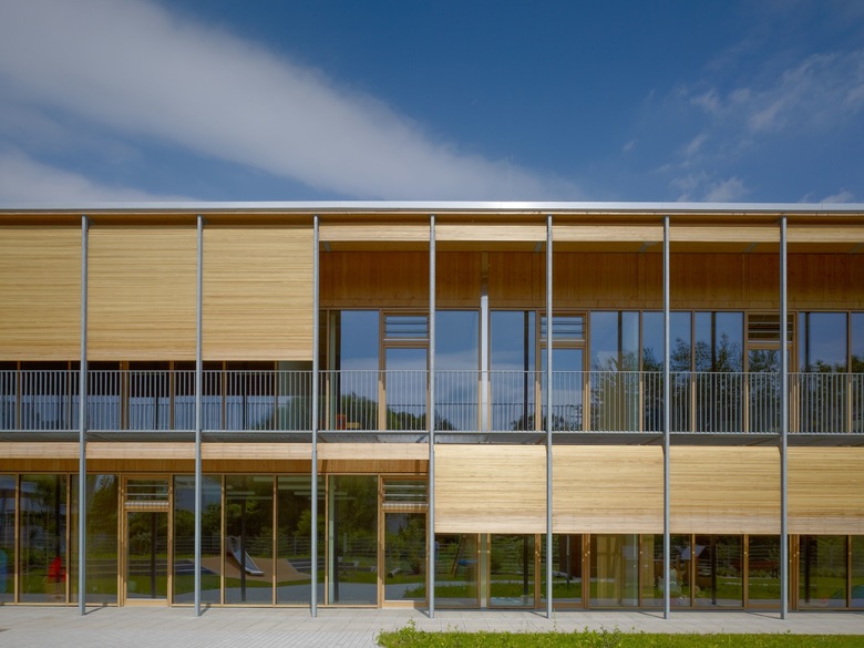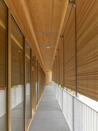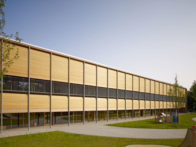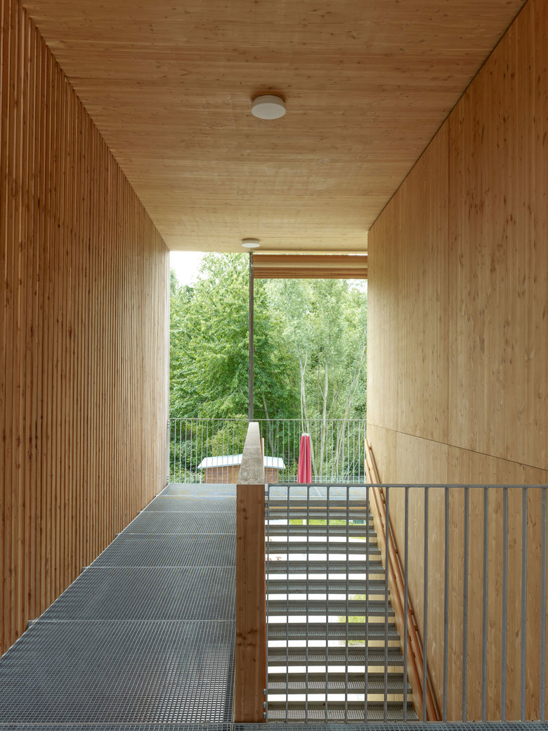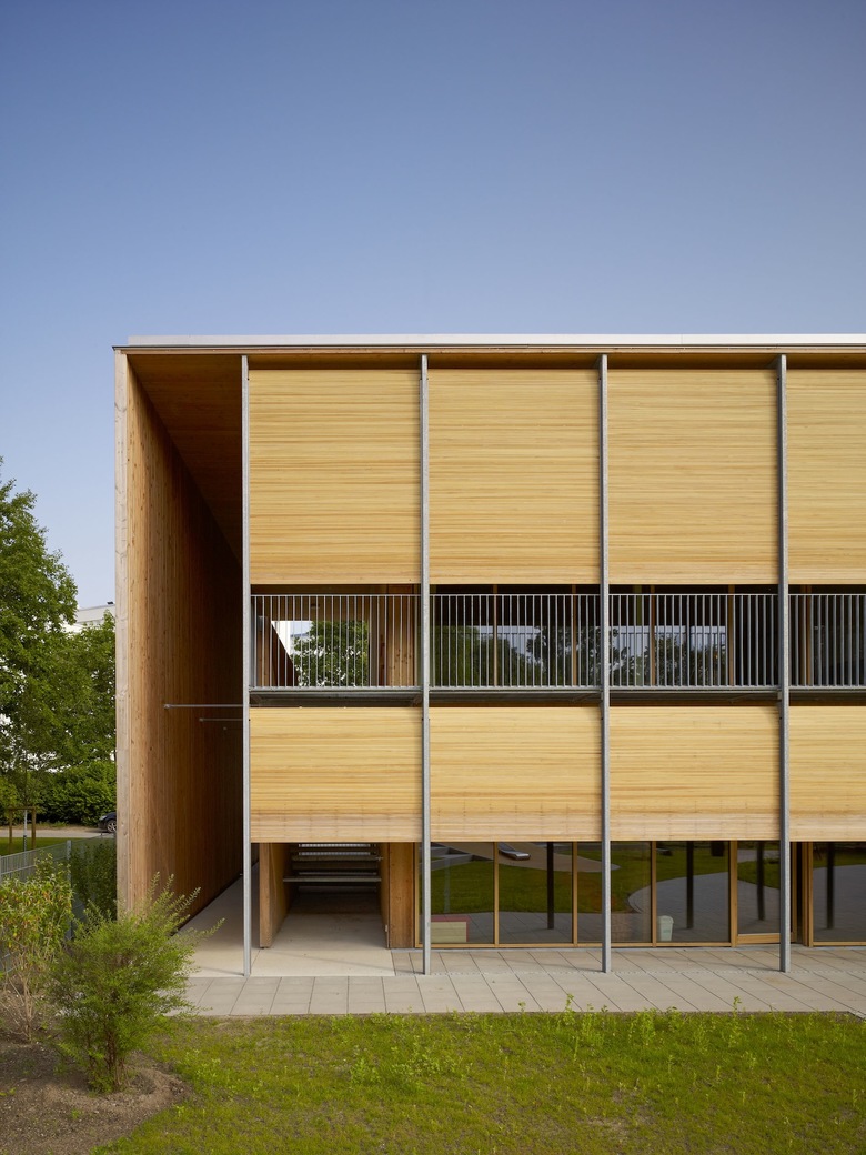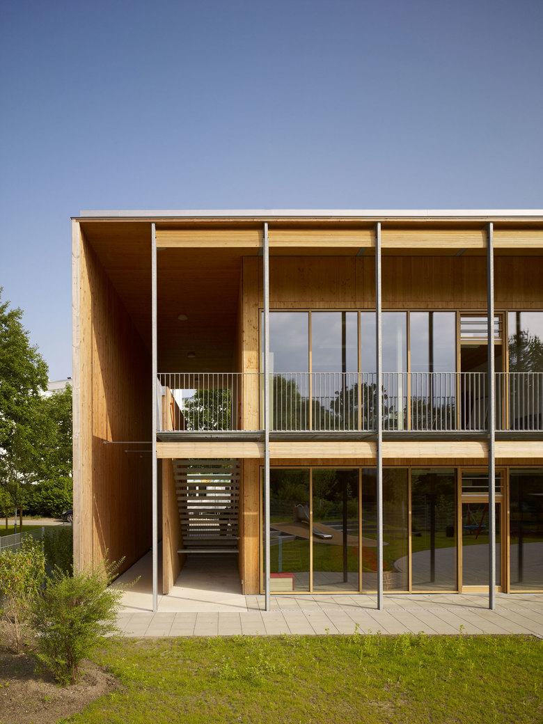 Reihung und Filter – Das Gebäude und die im Süden angrenzende Sporthalle schirmen die angrenzende Straße im Norden ab. Es bleibt eine schöne grüne Mitte für die Kinder. Nahe der Straße steht der Kindergarten und zeigt sich eher verschlossen mit einigen kleinen Fenstern und zwei hohen wettergeschützten Aussenfoyers, die einen großzügigen Eingang formulieren. Eine Vielzahl von vertikalen Douglasienstäben umhüllt das Haus zur Strasse, zur Wiese öffnet sich das Haus mit einer vollständigen Verglasung. Der vorgestellte Laubengang dient den Anforderungen des Brandschutzes, um allen Gruppenräumen einen direkten Weg ins Freie zu ermöglichen. Dennoch wird die Erscheinung durch die feine Detaillierung der Bodenflächen durch engmaschige Gitteroste und schlanke Stützen bereichert und sorgt auch für den notwendigen äußeren Sonnenschutz der Glasfassaden. Die Holzrollläden dienen der Verschattung und sorgen durch die feinen Lichtspalten für eine wohnliche Atmosphäre. Durch die räumliche Trennung der Fassadenschichten gelingt es die große Bautiefe einer hoch wärmegedämmten Hülle auf eine filigrane Weise zu überspielen.