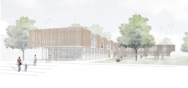 Der Neubau der Kita Seedorf ist in Holzbauweise geplant und folgt somit auch den Ansprüchen der Gemeinde an die Nachhaltigkeit.