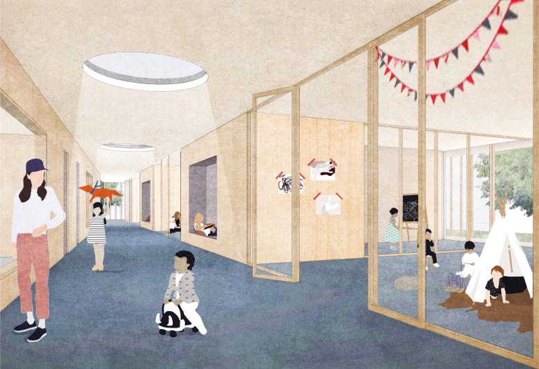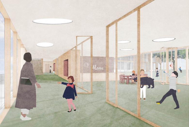 Das Dach-und Deckentragwerk soll demnach über eine Brettsperrholzplatte generiert werden, welche einachsig zwischen den Wänden, bzw. Unterzügen spannt. Die tragenden Außen- und Innenwände sind als Holzrahmenbauwände geplant. Im Bereich des Mehrzweckbereichs wird auf die großen Spannweiten mit einer sichtbaren Rippendecke reagiert, welche die Besonderheit des Gemeinschaftsbereichs auch gestalterisch hervorhebt.