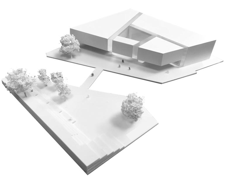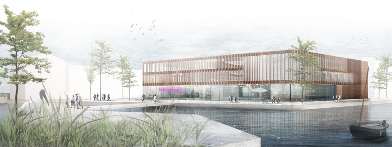 Der Neubau platziert sich leicht asymmetrisch auf dem von drei Seiten Wasser begrenzten Grundstück. An der westlichen Kanalseite weicht er etwas zurück, um dort der Caféterrasse Raum zu geben. Auf der nördlichen Eingangsseite entsteht ein trapezförmiger Vorplatz, welcher die beiden bestehenden Brücken verbindet. Am Schiffwasser, der Ostseite, rückt die Bibliothek nahe an die Uferkante.